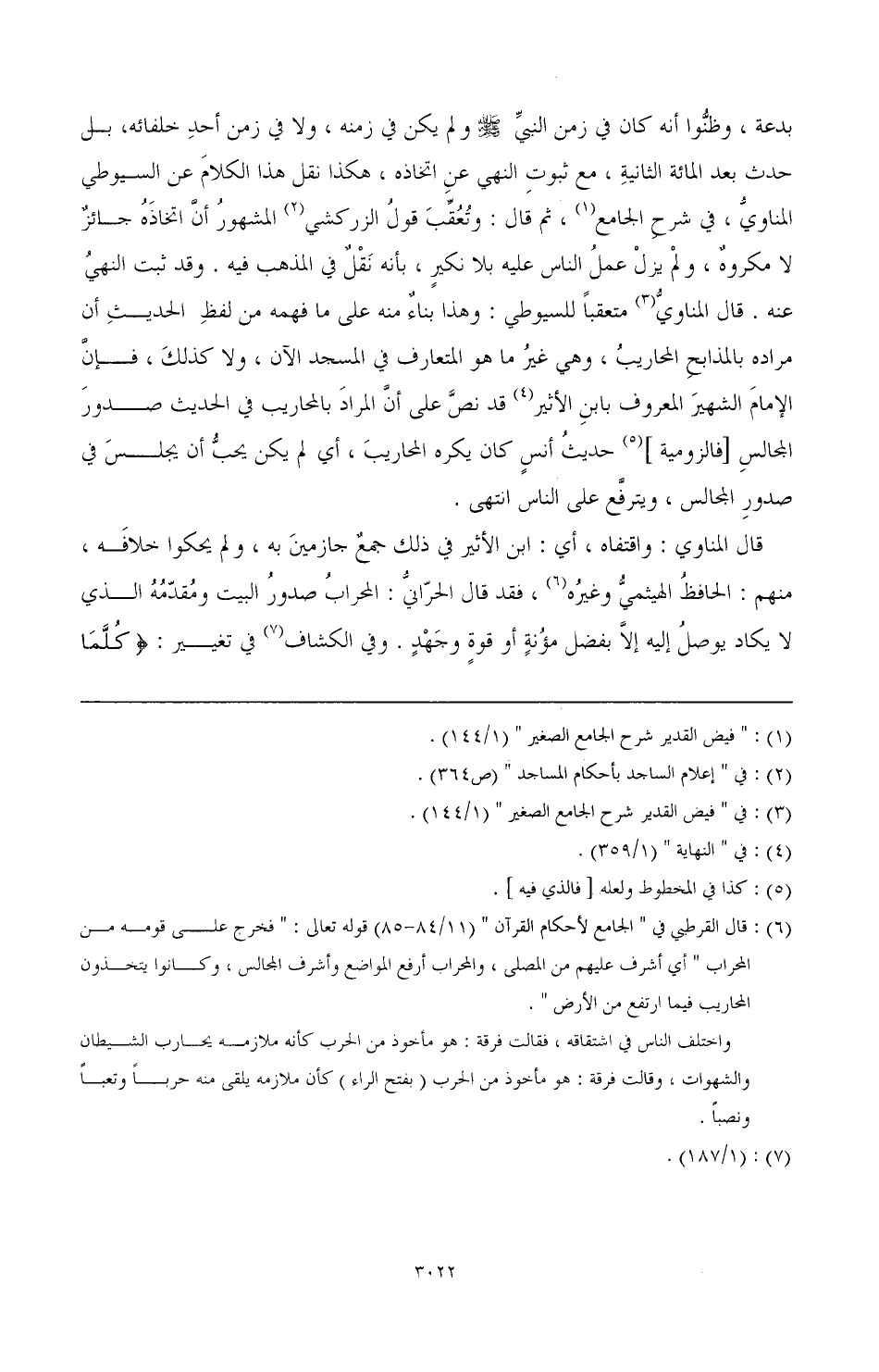 بدعة، وظنوا أنه كان في زمن النبي - صَلَّى اللهُ عَلَيْهِ وَسَلَّمَ - ولم يكن في زمنه، ولا زمن أحد خلفائه، بل حدث بعد المائة الثانية، مع ثبوت النهي عن اتخاذه، هكذا نقل هذا الكلام عن السيوطي المناوي، في شرح الجامع (¬1)، ثم قال: وتعقب قول الزركشي (¬2) المشهور أن اتخاذه جائز لا مكروه، ولم يزل عمل الناس عليه بلا نكير، بأنه نقل في المذهب فيه. وقد ثبت النهي عنه. قال المناوي (¬3) متعقبا للسيوطي: وهذا بناء منه على ما فهمه من لفظ الحديث أنه مراده بالمذابح المحاريب، وهي غير ما هو المتعارف في المسجد الآن، ولا كذلك، فإن الإمام الشهير المعروف بان الأثير (¬4) قد نص على أن المردا بالمحاريب في الحديث صدور المجالس [فالزومية] (¬5) حديث أنس كان يكره المحاريب، أي لم يكن يحب أن يجلس في صدور المجالس، ويترفع على الناس انتهي.
