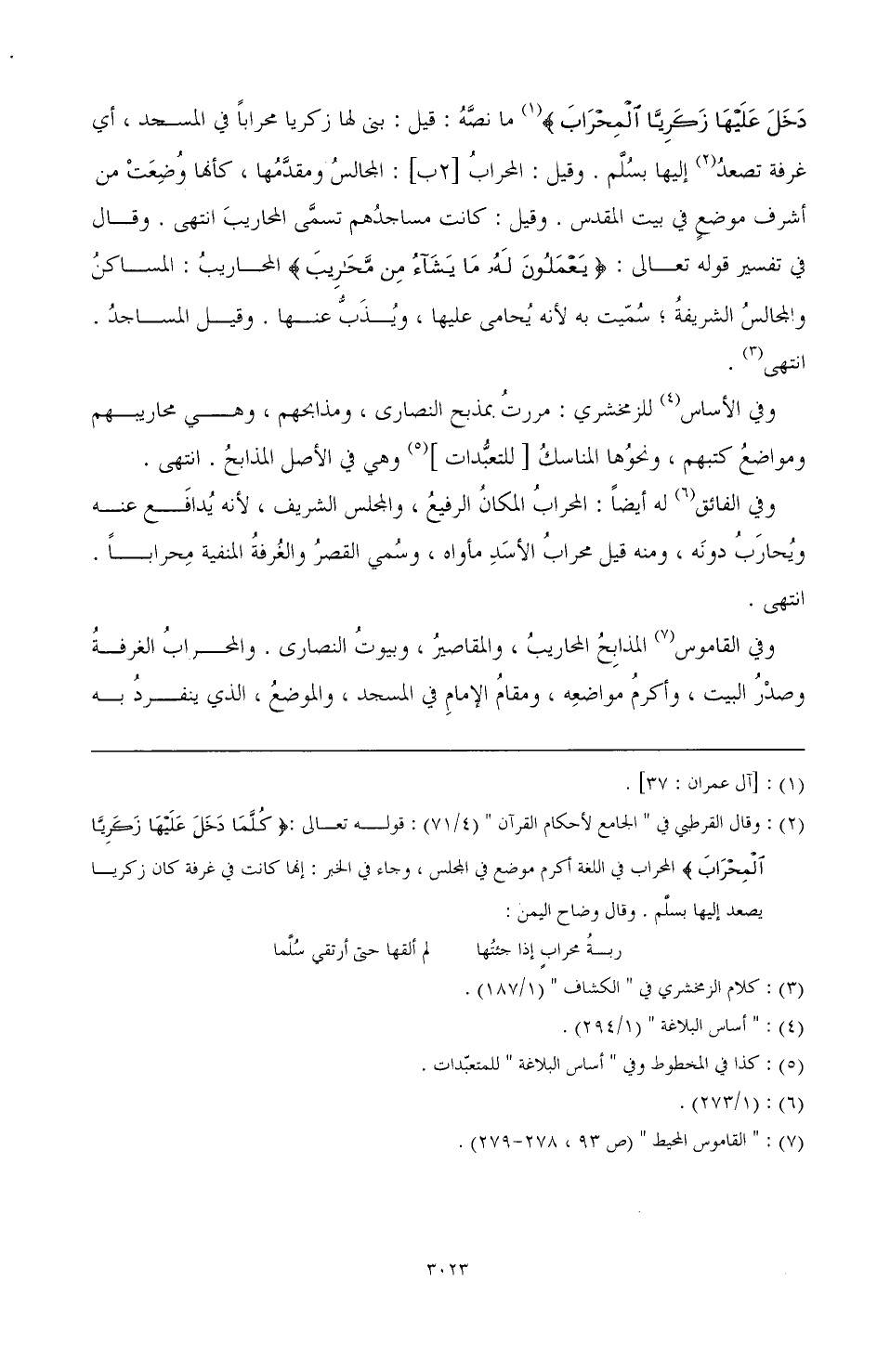 (¬2) وقال القرطبي في " الجامع لأحكام القرآن " (4/ 71): قوله تعالى: (كُلَّمَا دَخَلَ عَلَيْهَا زَكَرِيَّا الْمِحْرَابَ) المحراب في اللغة أكرم موضع في المجلس، وجاء في الخبر: إنها كانت في غرفة كان زكريا يصعد إليها بسلم. وقال وضاح اليمن: