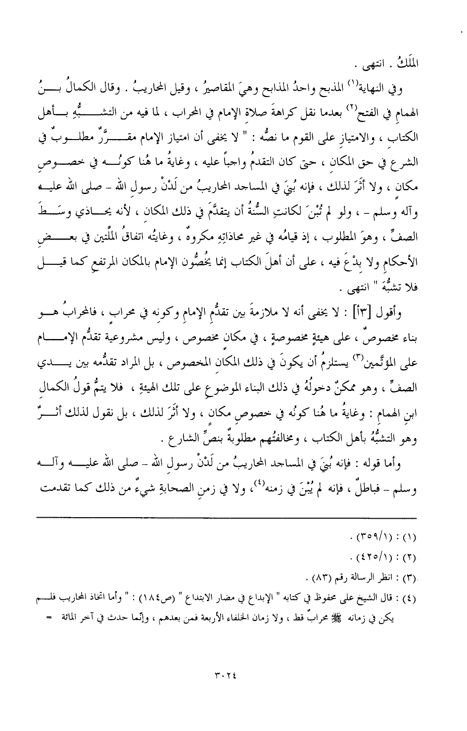 (¬4) قال الشيخ محفوظ في كتابه " الإبداع في مضار الابتداع " (ص 184): " وأما اتخاذ المحاريب فلم يكن في زمانه - صَلَّى اللهُ عَلَيْهِ وَسَلَّمَ - محراب قط، ولا زمان الخلفاء الأربعة فمن بعدهم، وإنما حدث في آخر المائة