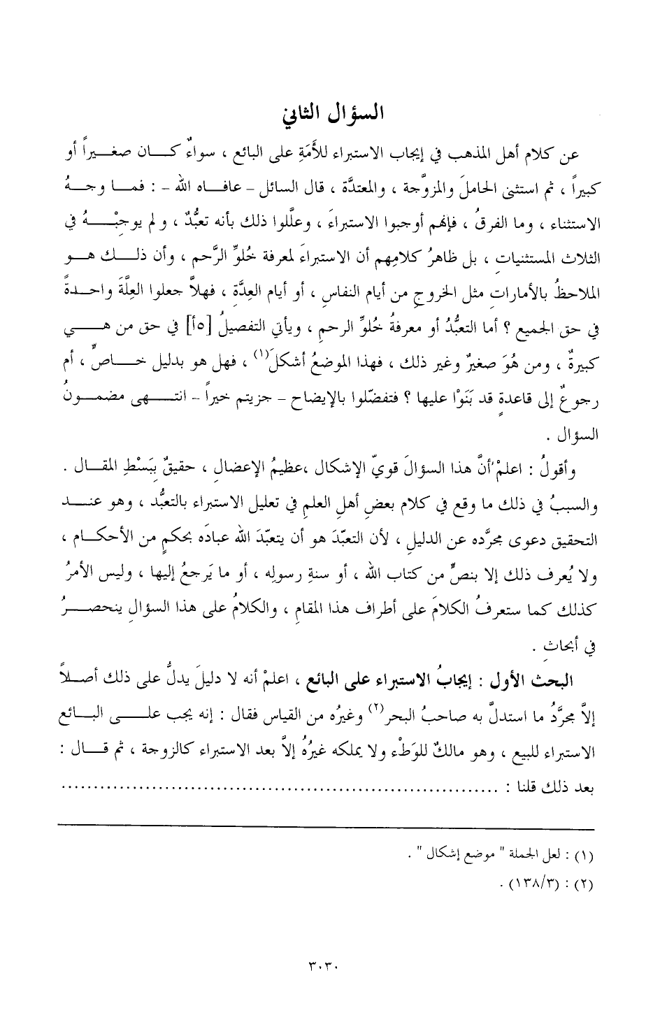 وأقول: أعلم أن هذا السؤال قوي الإشكال، عظيم الإعضال، حقيق ببسط المقال. والسبب في ذلك ما وقع في كلام بعض أهل العلم في تعليل الاستبراء بالتعبد، وهو عند التحقيق دعوى مجرده عن الدليل، لأن التعبد هو أن يتعبد الله عباده بحكم من الأحكام، ولا يعرف ذلك إلا بنص من كتاب الله، أو سنة رسوله، أو ما يرجع إليها، وليس الأمر كذلك كما ستعرف الكلام على أطراف هذا المقام، والكلام على هذا السؤال ينحصر في أبحاث. البحث الأول: إيجاب الاستبراء على البائع، اعلم أنه لا دليل يدل على ذلك أصلا إلا مجرد ما استدل به صاحب البحر (¬2) وغيره من القياس فقال: إنه يجب على البائع الاستبراء للبيع، وهو مالك للوطء ولا يملكه غيره إلا بعد الاستبراء كالزوجة، ثم قال: بعد ذلك قلنا:. .............................