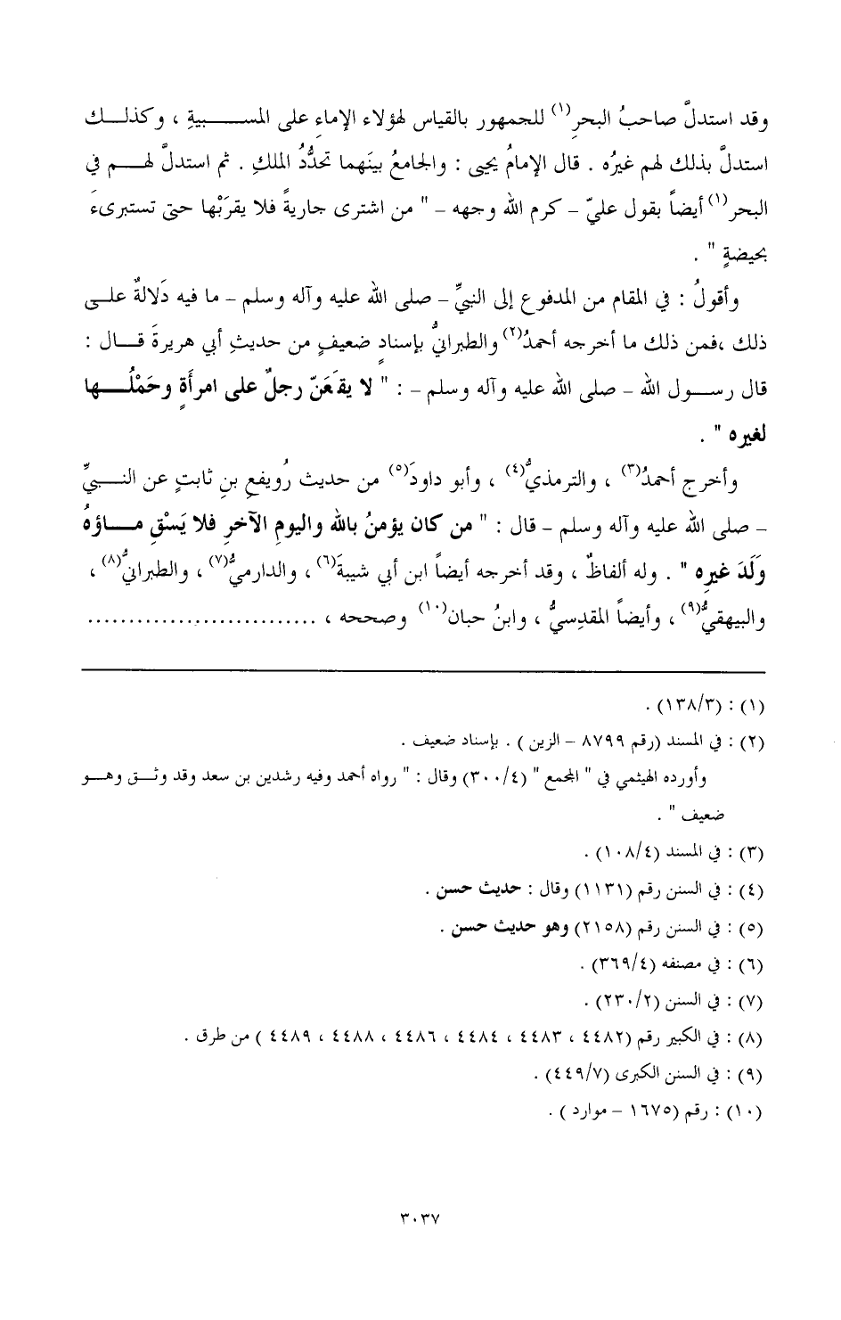 وأخرج أحمد (¬4)، والترمذي (¬5)، وأبو داود (¬6) من حديث رويفع بن ثابت عن النبي - صَلَّى اللهُ عَلَيْهِ وَآلِهِ وَسَلَّمَ - قال: " من كان يؤمن بالله واليوم الآخر فلا يسق ماؤه ولد غيره ". وله ألفاظ، وقد أخرجه أيضًا ابن أبي شيبة (¬7)، والدارمي (¬8)، والطبراني (¬9)، والبيهقي (¬10)، وأيضا المقدسي، وابن حبان (¬11) وصححه،. ...............................