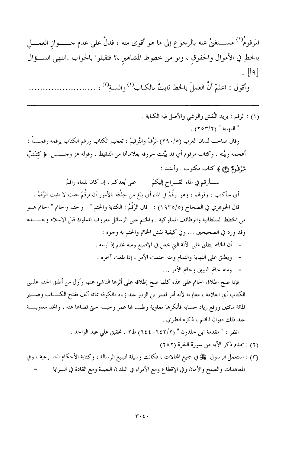 قال الجوهري في الصحاح (5/ 1935): " قال الرقم: الكتابة والختم " " والختم والخاتم " الخاتم هو من الخطط السلطانية والوظائف المملوكية. والختم على الرسائل معروف للملوك قبل الإسلام وبعده وقد ورد في الصحيحين. ... وفي كيفية نقش الخاتم والختم به وجوه: