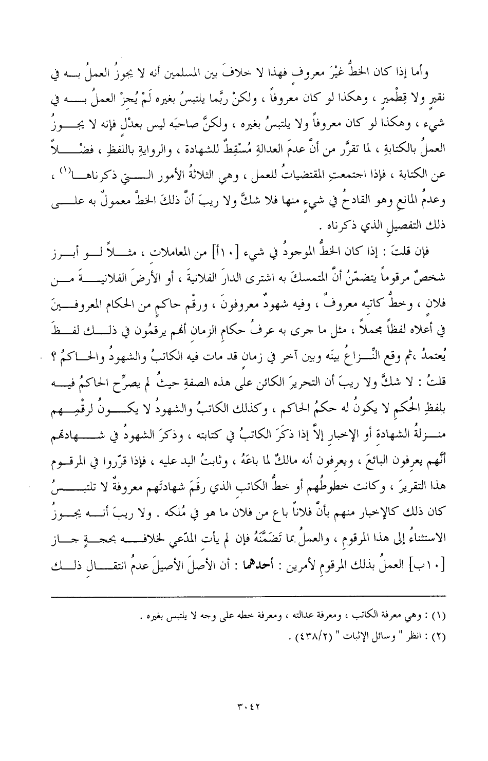 (¬1) وهي معرفة الكاتب، ومعرفة عدالته، ومعرفة خطه على وجه لا يلتبس بغيره.