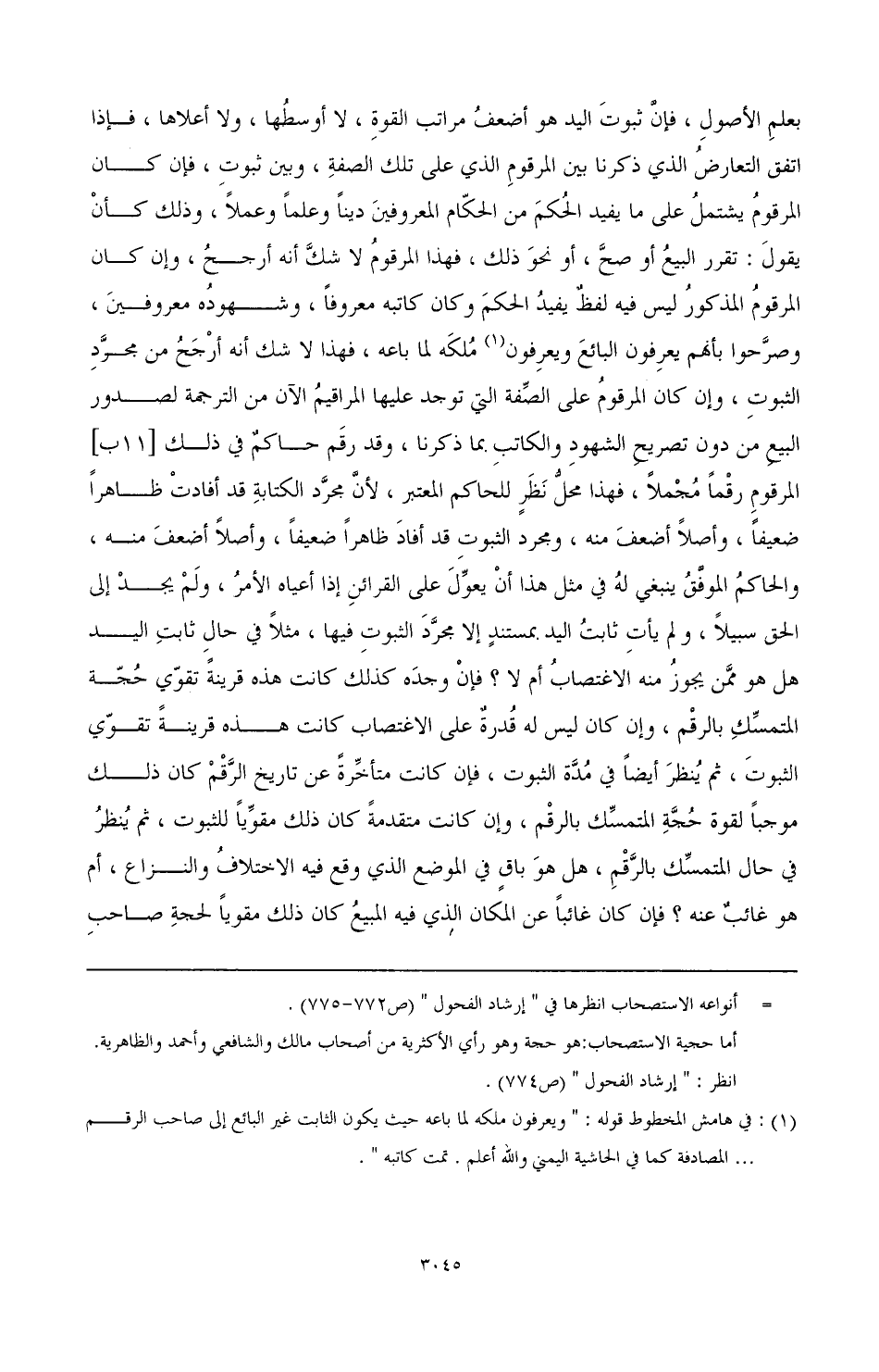 بعلم الأصول، فإن ثبوت اليد هو أضعف مراتب القوة، لا أوسطها، ولا أعلاها، فإذا اتفق التعارض الذي ذكرنا بين المرقوم الذي على تلك الصفة، وبين ثبوت، فإن كان المرقوم يشتمل على ما يفيد الحكم المعروفين دينا وعلما وعملا، وذلك كأن يقول: تقرر البيع أو صح، أو نحو ذلك، فهذا المرقوم لا شك أنه أرجح، وإن كان المرقوم المذكور ليس فيه لفظ يفيد الحكم وكان كاتبه معروفا، وشهوده معروفين، وصرحوا بأنهم يعرفون البائع ويعرفون (¬1) ملكه لما باعه، فهذا لا شك أنه أرجح من مجرد الثبوت، وإن كان المرقوم على الصفة التي توجد عليها المراقيم الآن من الترجمة لصدور البيع من دون تصريح الشهود والكاتب بما ذكرنا، وقد رقم حاكم في ذلك [11 ب] المرقوم رقما مجملا، فهذا محل نظر للحاكم المعتبر، لأن مجرد الكتابة قد أفادت ظاهرا ضعيفا، وأصلا أضعف منه، ومجرد الثبوت قد أفاد ظاهرا ضعيفا، وأصلا أضعف منه، والحاكم الموفق ينبغي له في مثل هذا أن يعول على القرائن إذا أعياه الأمر، ولم يجد إلى الحق سبيلا، ولم يأت ثابت اليد بمستند إلا مجرد الثبوت فيها، مثلا في حال ثابت اليد هل هو ممن يجوز منه الاغتصاب أم لا؟ فإن وجده كذلك كانت هذه قرينة تقوي حجة المتمسك بالرقم، وأن كان ليس له قدره على الاغتصاب كانت هذه قرينة تقوي الثبوت، ثم ينظر أيضًا في مدة الثبوت، فإن كانت متأخرة عن تاريخ الرقم كان ذلك موجبا لقوة حجة المتمسك بالرقم، وأن كانت متقدمة كان ذلك مقويا للثبوت، ثم ينظر في حال المتمسك بالرقم، هل هو باق في الموضع الذي وقع فيه الاختلاف والنزاع، أم هو غائب عنه؟ فإن كان غائبا عن المكان الذي فيه المبيع كان ذلك مقويا لحجة صاحب