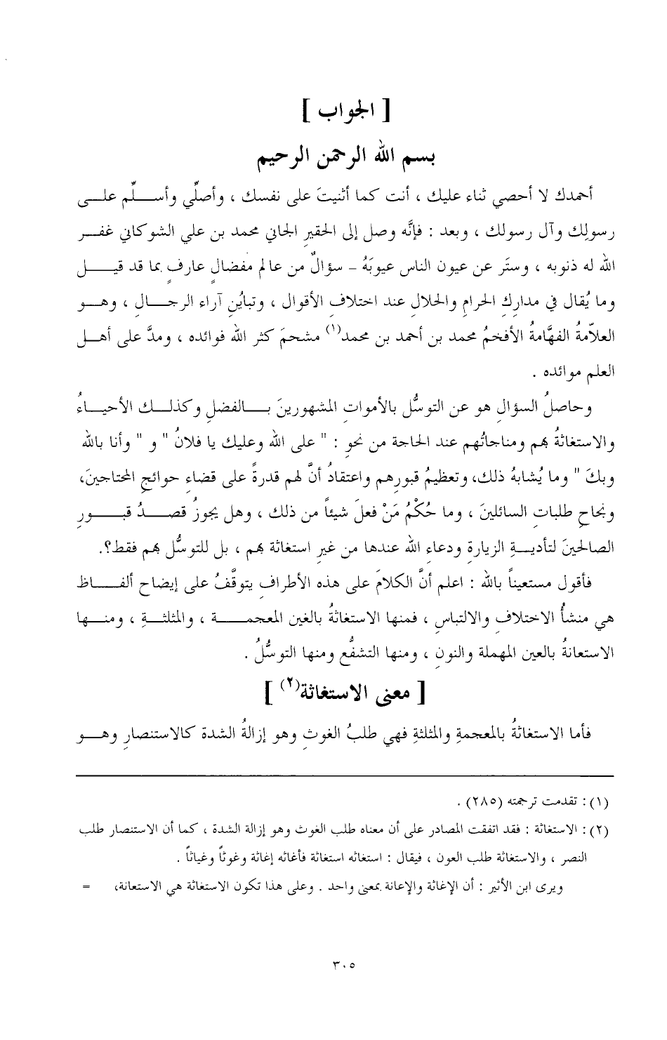 فأقول مستعينا بالله: اعلم أن الكلام على هذه الأطراف يتوقف على إيضاح ألفاظ هي منشأ الاختلاف والالتباس، فمنها الاستغاثة بالغين المعجمة، والمثلثة، ومنها الاستعانة بالعين المهملة والنون، ومنها التشفع ومنها التوسل.
