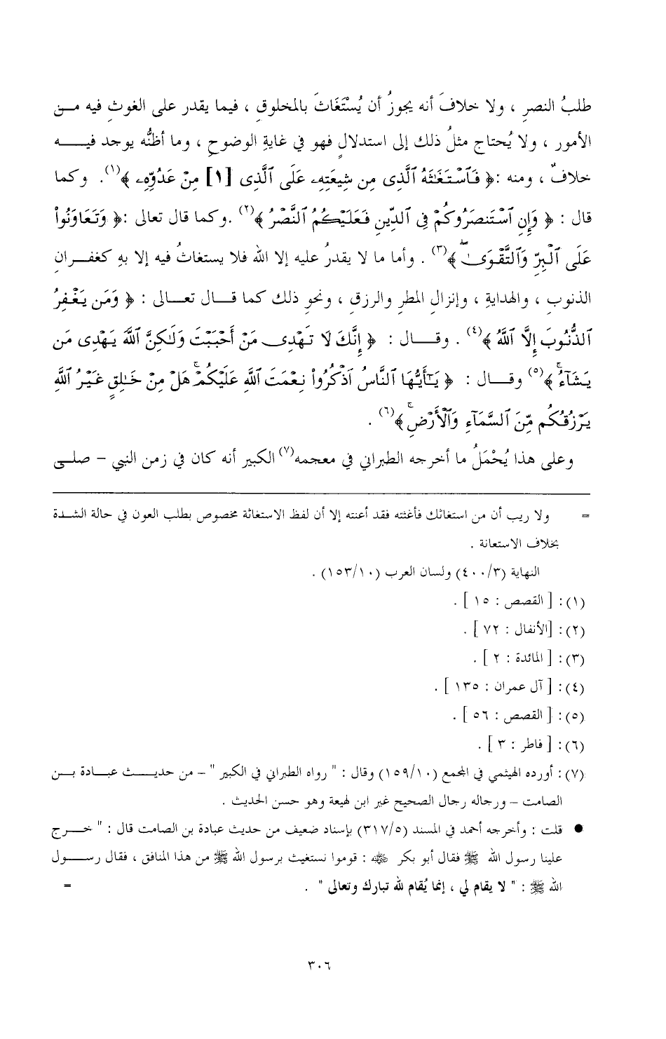 طلب النصر، ولا خلاف أنه يجوز أن يستغاث بالمخلوق، فيما يقدر على الغوث فيه من الأمور، ولا يحتاج مثل ذلك إلى استدلال فهو في غاية الوضوح، وما أظنه يوجد فيه خلاف، ومنه:} فاستغاثه الذي من شيعته على الذي من عدوه {(¬1). وكما قال:} وإن استنصروكم في الدين فعليكم النصر {(¬2). وكما قال تعالى:} وتعاونوا على البر والتقوى {(¬3). وأما ما لا يقدر عليه إلا الله فلا يستغاث فيه إلا به كغفران الذنوب، والهداية، وإنزال المطر والرزق، ونحو ذلك كما قال تعالى:} ومن يغفر الذنوب إلا الله {(¬4). وقال:} إنك لا تهدي من أحببت ولكن الله يهدي من يشاء {(¬5)، وقال:} يا أيها الناس اذكروا نعمت الله عليكم هل من خالق غير الله يرزقكم من السماء والأرض {(¬6).