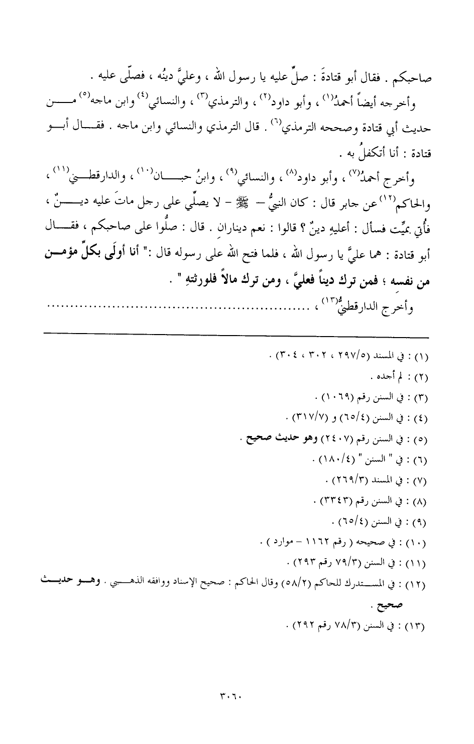وأخرج أحمد (¬7)، وأبو داود (¬8)، والنسائي (¬9)، وابن حبان (¬10) والدارقطني (¬11)، والحاكم (¬12) عن جابر قال: كان النبي - صَلَّى اللهُ عَلَيْهِ وَسَلَّمَ - لا يصلي على رجل مات عليه دين، فأتي بميت فسأل: أعليه دين؟ قالوا: نعم ديناران. قال: صلوا على صاحبكم، فقال أبو قتادة: هما علي يا رسول الله، فلما فتح الله على رسوله قال: أنا أولى بكل مؤمن من نفسه؛ فمن ترك دينا فعلي، ومن ترك مالا فلورثته ".