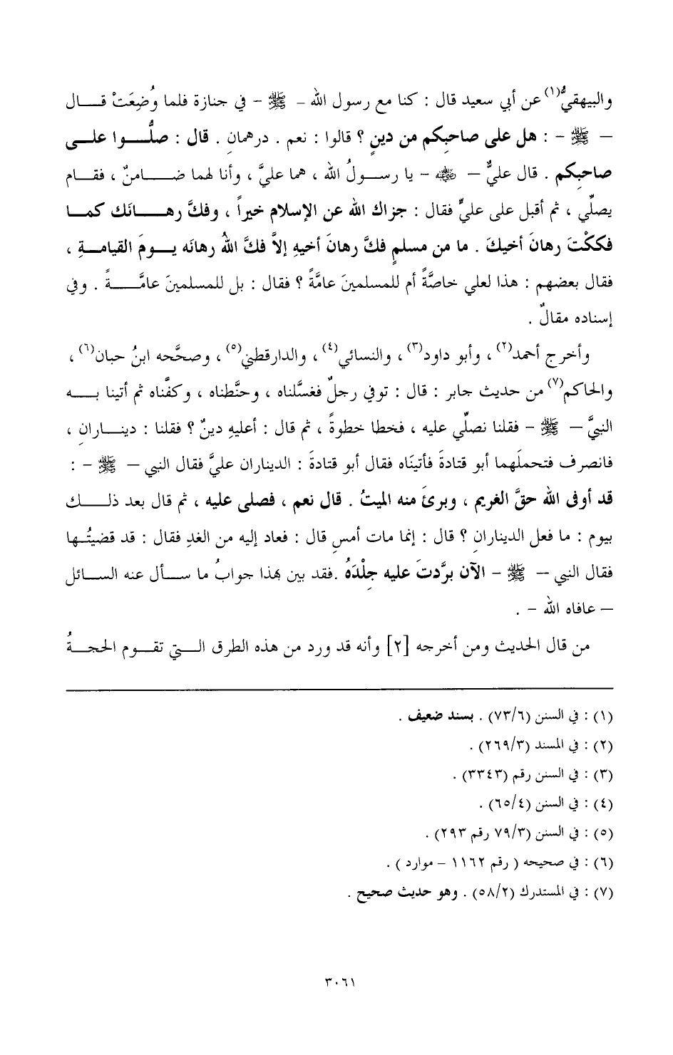 وأخرج أحمد (¬2)، وأبو داود (¬3)، والنسائي (¬4)، والدارقطني (¬5)، وصححه ابن حبان (¬6)، والحاكم (¬7) من حديث جابر: قال: توفي رجل فغسلناه، كفناه ثم أتينا به النبي - صَلَّى اللهُ عَلَيْهِ وَسَلَّمَ - فقلنا نصلي عليه، فخطا خطوة، ثم قال: أعليه دين؟ فقلنا: ديناران، فانصرف فتحملهما أبو قتادة: الديناران علي فقال النبي - صَلَّى اللهُ عَلَيْهِ وَسَلَّمَ -: قد أوفي الله حق الغريم، وبرمنه الميت. قال نعم، فصلى عليه، ثم قال بعد ذلك بيوم: ما فعل الديناران؟ قال: إنما مات أمس قال: فعاد إليه من الغد فقال: قد قضيتها فقال النبي- صَلَّى اللهُ عَلَيْهِ وَسَلَّمَ - الآن بردت عليه جلده. فقد بين بهذا الجواب ما سأل عنه السائل - عافاه الله -.