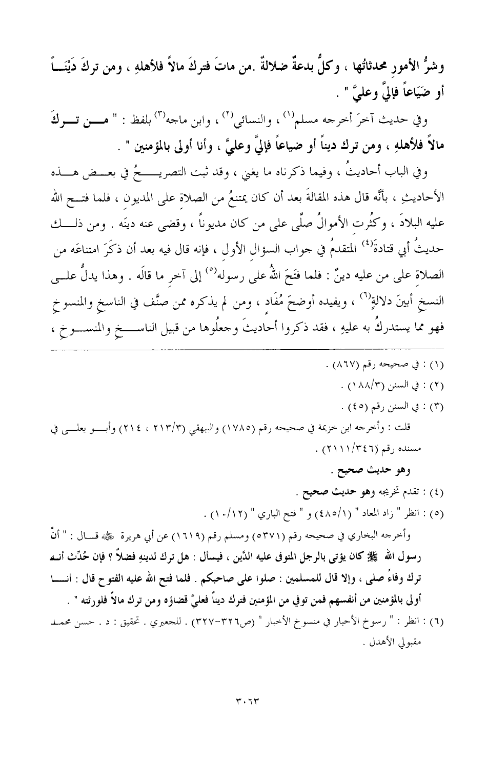 وفي حديث آخر أخرجه مسلم (¬1)، والنسائي (¬2)، وابن ماجه (¬3) وفي الباب أحاديث، فيما ذكرناه ما يعني، وقد ثبت التصريح في بعض هذه الأحاديث، بأنه قال هذه المقالة بعد أن كان يمتنع من الصلاة على المديون، فلما فتح الله عليه البلاد، وكثر الأموال صلى على من كان مديونا، وقضى عنه دينه. ومن ذلك حديث أبي قتادة (¬4) المتقدم في جواب السؤال الأول، فإنه قال فيه بعد أن ذكر أمتناعه من الصلاة على من عليه دين: فلما فتح الله على رسوله (¬5) إلى آخر ما قاله. وهذا يدل على النسخ أبين دلالة (¬6)، ويفيده أوضح مفاد، ومن لم يذكره ممن صنف في الناسخ والمنسوخ فهو مما يستدرك به عليه، فقد ذكروا أحاديث وجعلوها من قبيل الناسخ والمنسوخ،