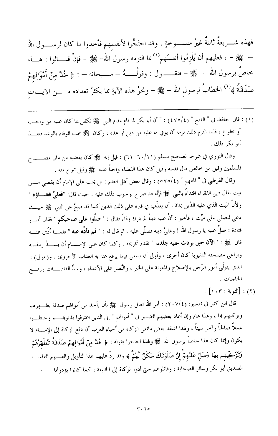 قال ابن كثير في تفسيره (4/ 207): أمر الله تعالى رسول - صَلَّى اللهُ عَلَيْهِ وَسَلَّمَ - بأن يأخذ من أموالهم صدقة يطهرهم ويزكيهم بها، وهذا عام وإن أعاد بعضهم الضمير في " أموالهم " إلى الذين اعترفا بذنوبهم وخلطوا عملا صالحا وآخر سيئا، ولهذا اعتقد بعض مانعي الزكاة من أحياء العرب أن دفع الزكاة إلى الأمام لا يكون وإنما كان هذا خاصا برسول الله - صَلَّى اللهُ عَلَيْهِ وَسَلَّمَ - ولهذا احتجوا بقوله: (خُذْ مِنْ أَمْوَالِهِمْ صَدَقَةً تُطَهِّرُهُمْ وَتُزَكِّيهِمْ بِهَا وَصَلِّ عَلَيْهِمْ إِنَّ صَلَاتَكَ سَكَنٌ لَهُمْ) وقد رد عليهم هذا التأويل والفهم الفاسد الصديق أبو بكر وسائر الصحابة، وقاتلوهم حتى أدوا الزكاة إلى الخليفة. كما كانوا يؤدونها إلى رسول الله - صَلَّى اللهُ عَلَيْهِ وَسَلَّمَ - حتى قال الصديق والله لو منعوني عقالا كانوا يؤدونه إلى رسول الله - صَلَّى اللهُ عَلَيْهِ وَسَلَّمَ - لأقاتلنهم على منعه. أخرجه البخاري في صحيحه رقم (7284 و7285).