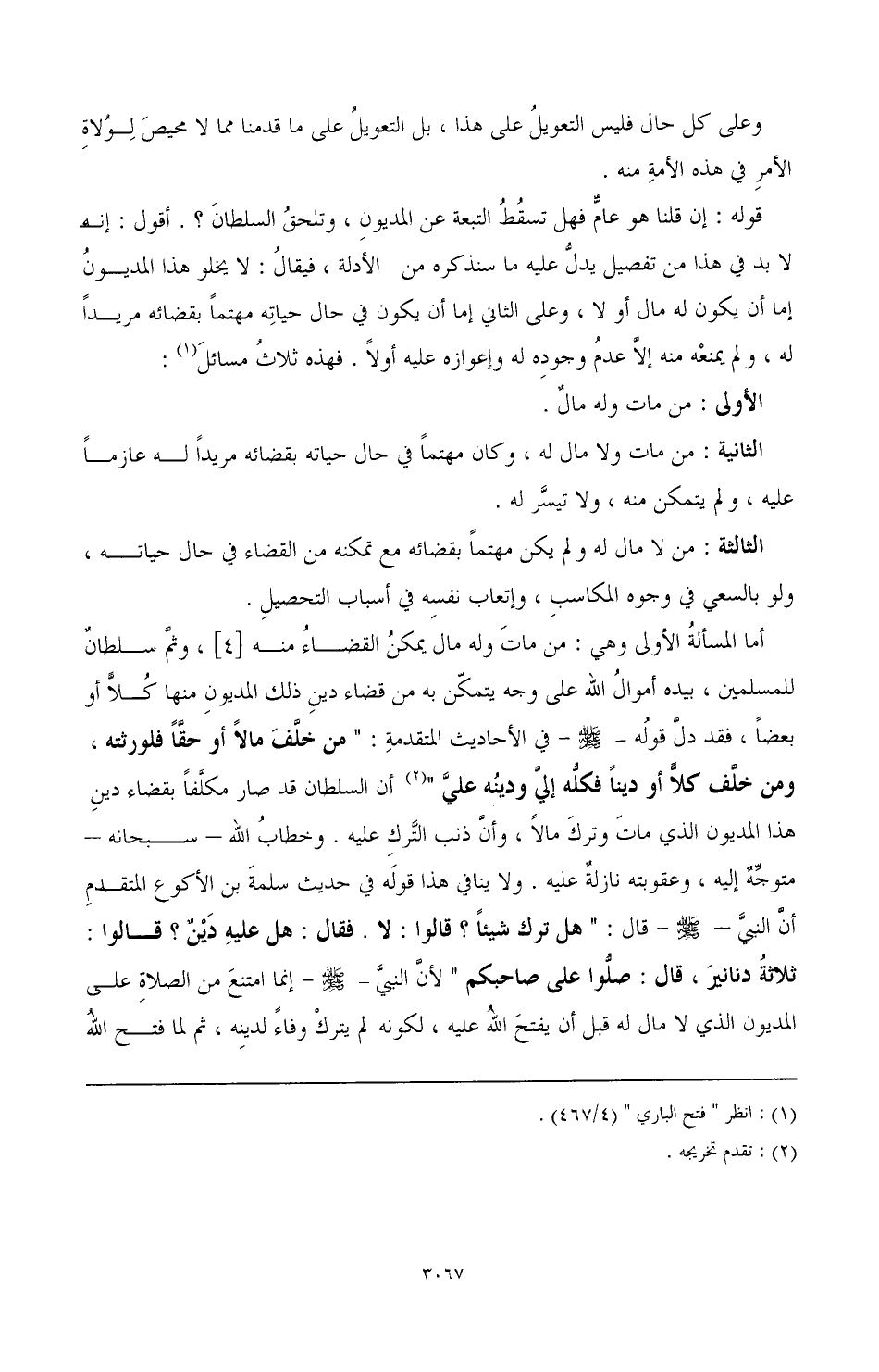 قوله: إن قلنا هو عام فهل تسقط التبعة عن المديون، وتلحق السلطان؟. أقول: إنه لا بد في هذا من تفصيل يدل عليه ما سنذكره من الأدلة، فيقال: لا يخلو هذا المديون إما أن يكون له مال أو لا، وعلى الثاني إما أن يكون في حال حياته مهتما بقضائه مريدا له، ولم يمنعه منه إلا عدم وجوده له وإعوازه عليه أولا. فهذه ثلاث مسائل (¬1).