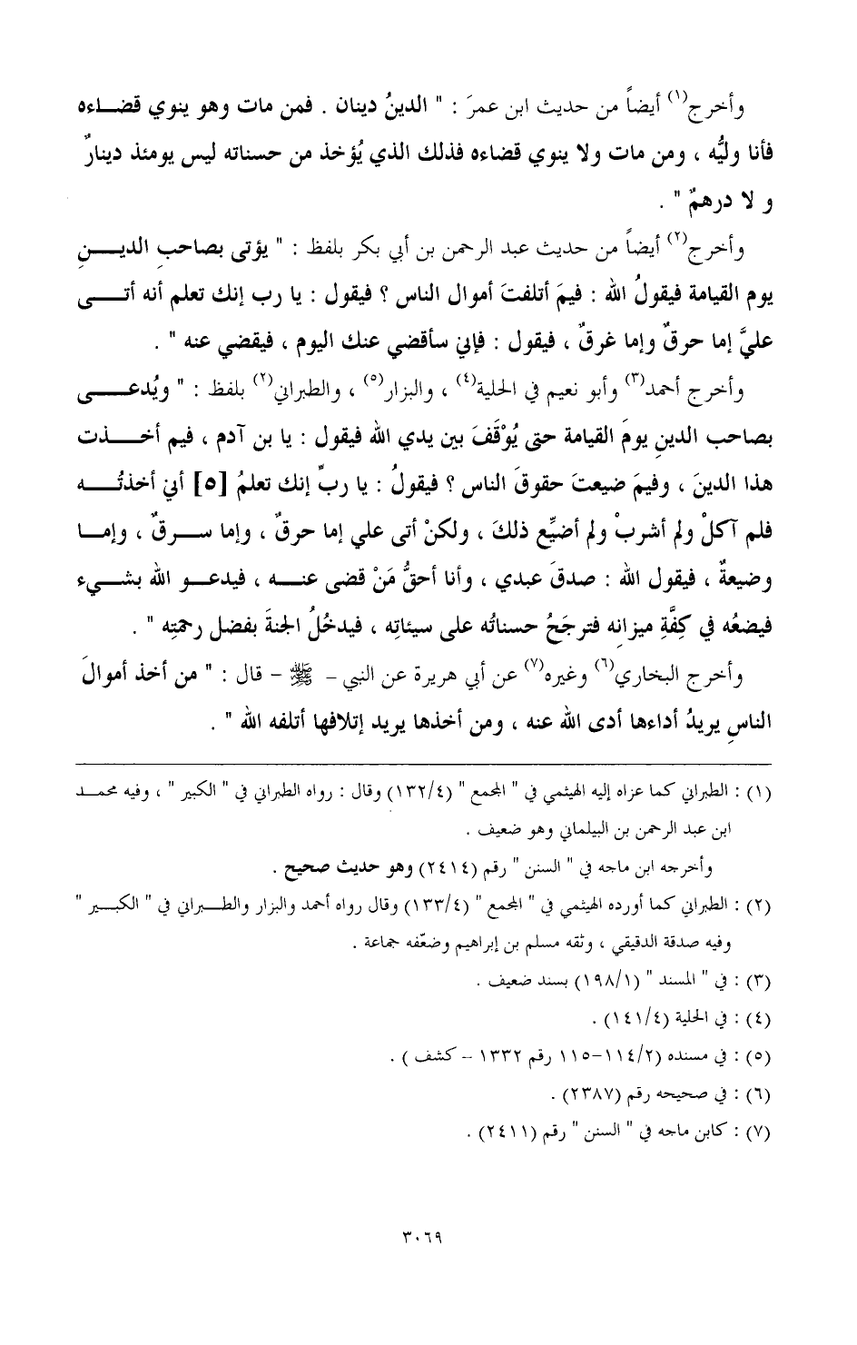 وأخرج أحمد (¬3) وأبو نعيم في الحلية (¬4)، والبزار (¬5)، والطبراني (¬6) بلفظ: " ويدعى بصاحب الدين يوم القيامة حتى يقف بين يدي الله فيقول: يا بن آدم، فيم أخذت هذا الدين، وفيم ضعيت حقوق الناس؟ فيقول: يارب إنك تعلم [5] أني أخذته فلم آكل ولم أشرب ولم أضيع ذلك، ولكن أتي علي إما حرق، وإما سرق، وإما وضيفة، فيقول الله: صدق عبدي، وأنا أحق من قضى عنه، فيدعو الله بشيء فيضعه في كفة ميزانه فترجح حسناته على سيئاته، فيدخل الجنة بفضل رحمته ".