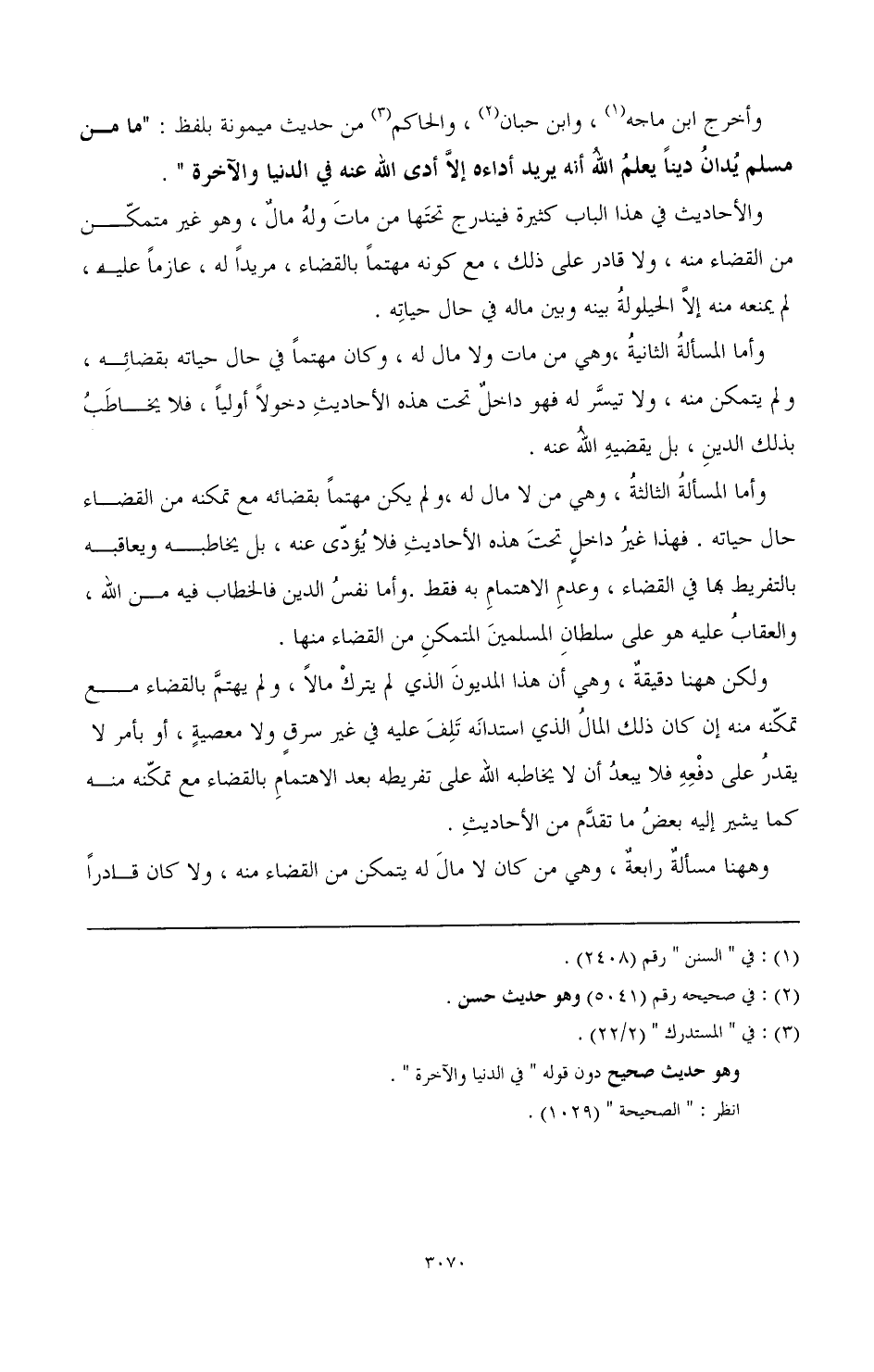 وأما المسألة الثالثة، وهي من لا مال له، ولم يكن مهتما بقضائه، ولم يتمكن منه، ولا تيسر له فهو داخل تحت هذه الأحاديث دخولا أوليا، فلا يخاطب بذلك الدين، بل يقضيه الله عنه. وأما المسألة الثالثة، وهي من لا مال له، ولم يكن مهتما يقضائه مع تمكنه من القضاء حال حياته. فهذا غير داخل تحت هذه الأحاديث فلا يؤدى عنه، بل يخاطبه ويعاقبه بالتفريط بها في القضاء، وعدم الاهتمام به فقط. وأما نفس الدين فالخطاب فيه من الله، والعقاب عليه هو على سلطان المسلمين المتمكن من القضاء منها.