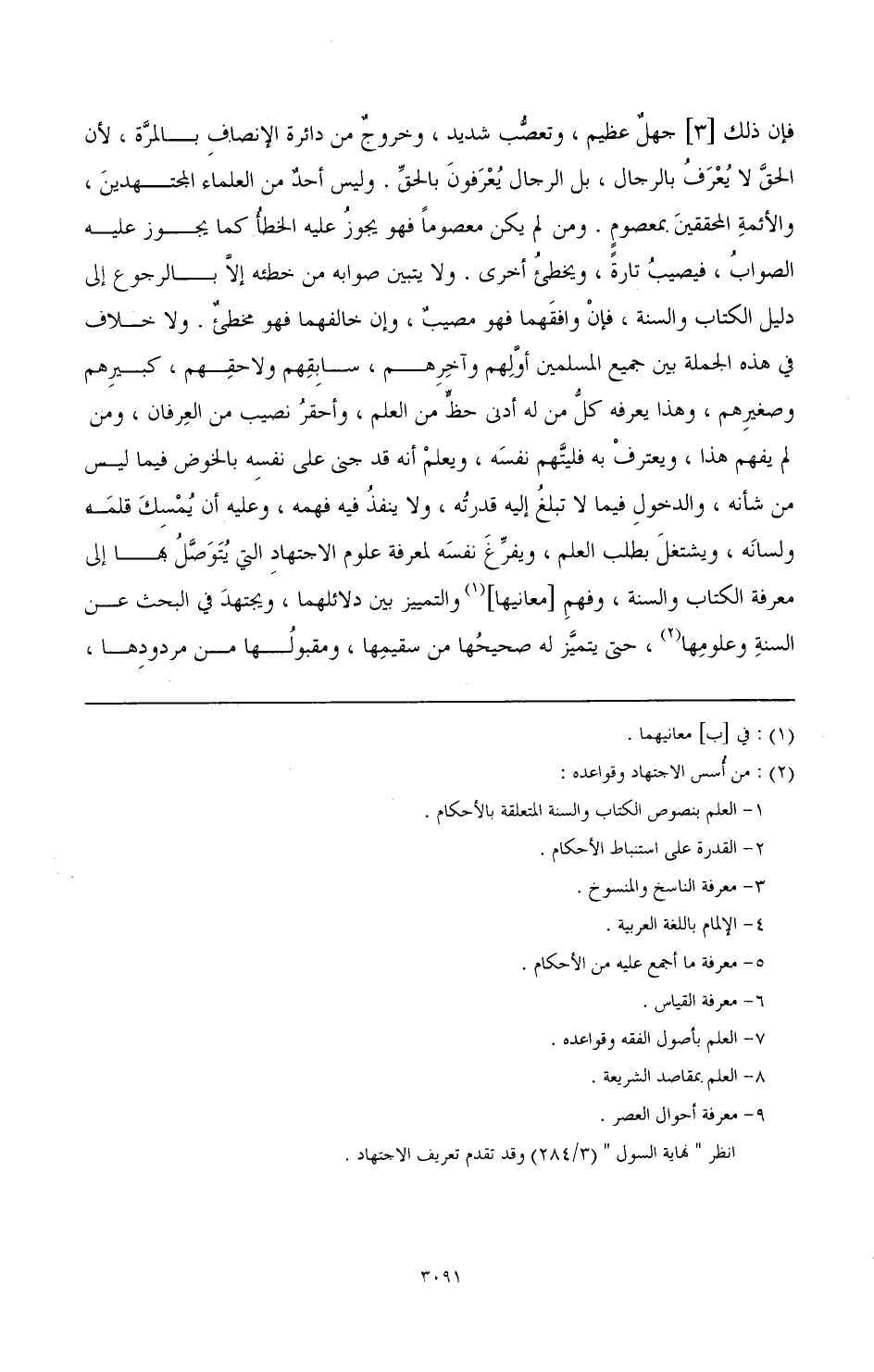 فإن ذلك [3] جهل عظيم، وتعصب شديد، وخروج من دائرة الإنصاف بالمرة، لأن الحق لا يعرف بالرجال، بل الرجال يعرفون بالحق. وليس أحد من العلماء المجتهدين، والأئمة المحققين بمعصوم. ومن لم يكن معصوما فهو يجوز عليه الخطأ كما يجوز عليه الصواب، فيصيب تارة، ويخطئ أخرى. ولا يتبين صوابه من خطئه إلا بالرجوع إلى دليل الكتاب والسنة، فإن واقفهما فهو مصيب، وإن خالفهما فهو مخطئ. ولا خلاف في هذه الجملة بين جميع المسلمين أولهم وآخرهم، سابقهم ولا حقهم، كبيرهم وصغيرهم، وهذا يعرف كل من له أدني حظ من العلم، وأحقر نصيب من العرفان، ومن لم يفهم هذا، ويعترف به فليتهم نفسه، ويعلم أنه قد جني على نفسه بالخوض فيما ليس من شأنه، والدخول فيما لا تبلغ إليه قدرته، ولا ينفد فيه فهمه، وعليه أن يمسك قلمه ولسانه، ويشتغل بطلب العلم، ويفرغ نفسه لمعرفة علوم الاجتهاد التي يتوصل بها إلى معرفة الكتاب والسنة، وفهم [معانيها] (¬1) والتمييز بين دلائلهما، ويجتهد في البحث عن السنة وعلومها (¬2) حتى يتميز له صحيحها من سقيمها، ومقبولها من مردودها،