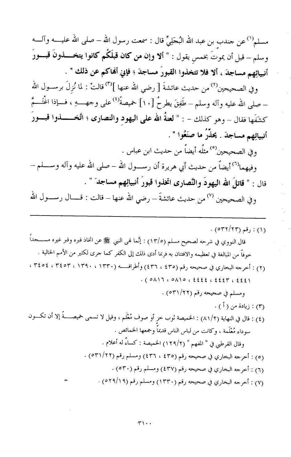 مسلم (¬1) عن جندب بن عبد الله البجلي قال: رسول الله - صَلَّى اللهُ عَلَيْهِ وَآلِهِ وَسَلَّمَ - قبل أن يموت بخمس يقول: " ألا وإن من كان قبلكم كانوا يتخذون قبور أنبيائهم مساجد، ألا فلا تتخدوا القبور مساجد؛ فإن أنهاكم عن ذلك ".