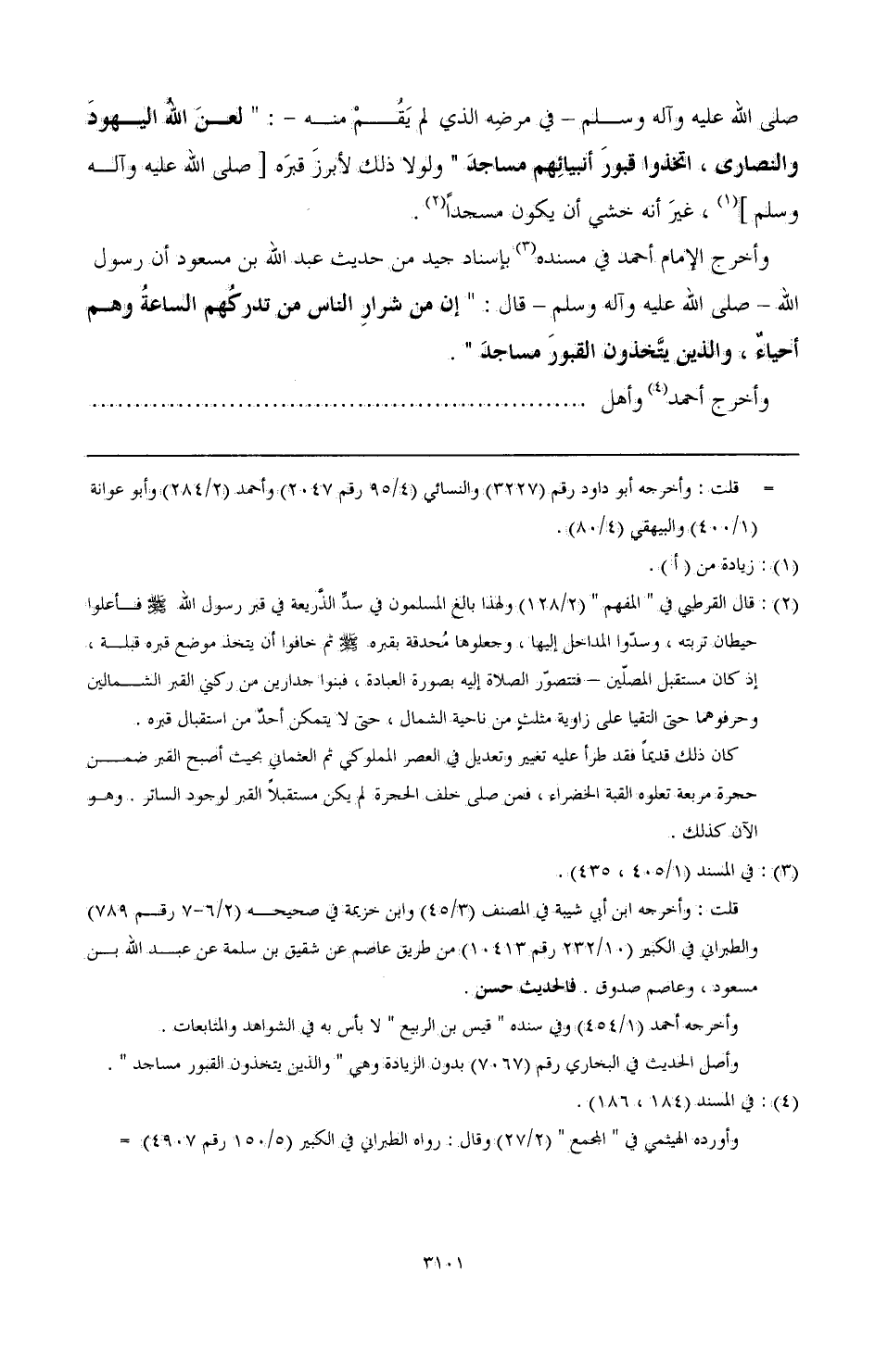 وأخرج الإمام أحمد في مسنده (¬3) بإسناد جيد من حديث عبد الله بن مسعود أن رسول الله - صَلَّى اللهُ عَلَيْهِ وَآلِهِ وَسَلَّمَ - قال: " إن شرار الناس من تدركهم الساعة وهم أحياء، والذين يتخذون القبور مساجد ".