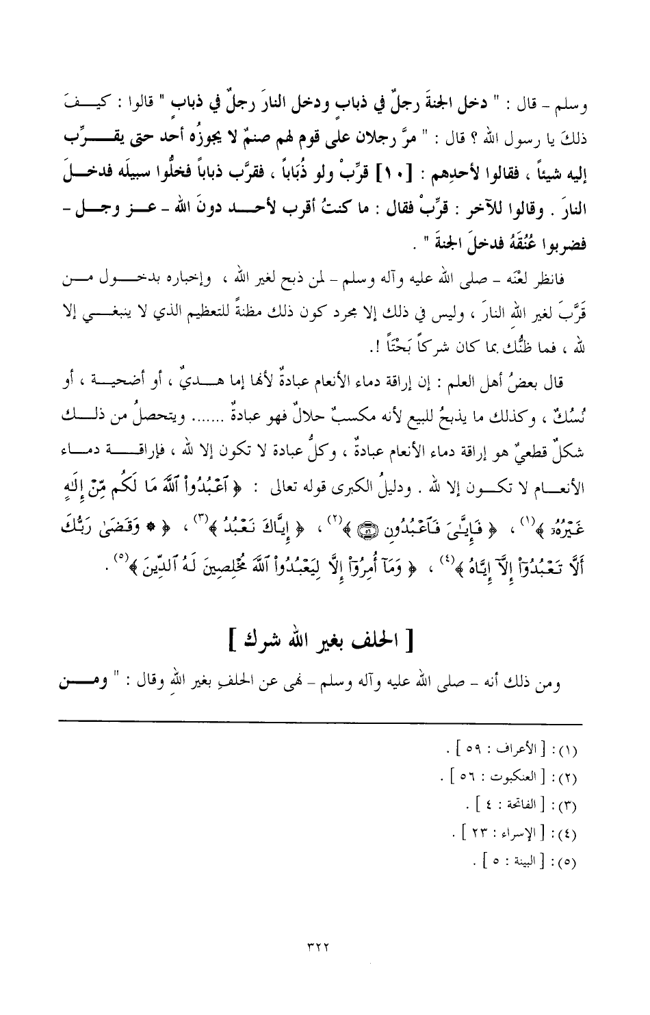 فانظر لعنه -صَلَّى اللهُ عَلَيْهِ وَآلِهِ وَسَلَّمَ- لمن ذبح لغير الله، وإخباره بدخول من قرب لغير الله النار، وليس في ذلك إلا مجرد كون ذلك مظنة للتعظيم الذي لا ينبغي إلا لله، فما ظنك بما كان شركا بحتا!.