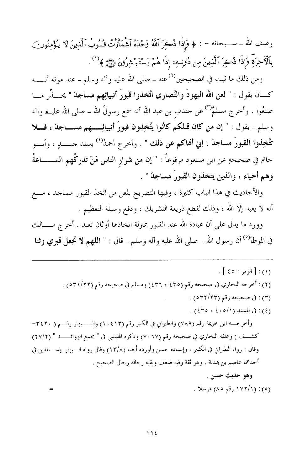 والأحاديث في هذا الباب كثيرة، وفيها التصريح بلعن من اتخذ القبور مساجد، مع أنه لا يعبد إلا الله، وذلك لقطع ذريعة التشريك، ودفع وسيلة التعظيم.