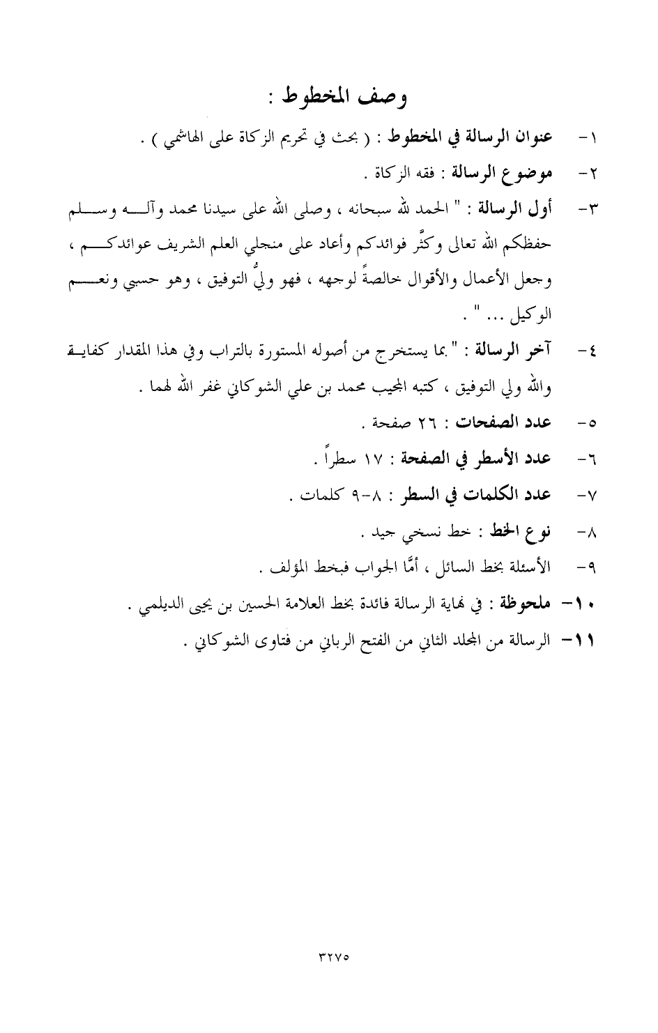 4 - آخر الرسالة: بما يستخرج من أصوله المستورة بالتراب وفي هذا المقدار كفاية والله ولي التوفيق، كتبه المجيب محمد بن علي الشوكاني غفر الله لهما.