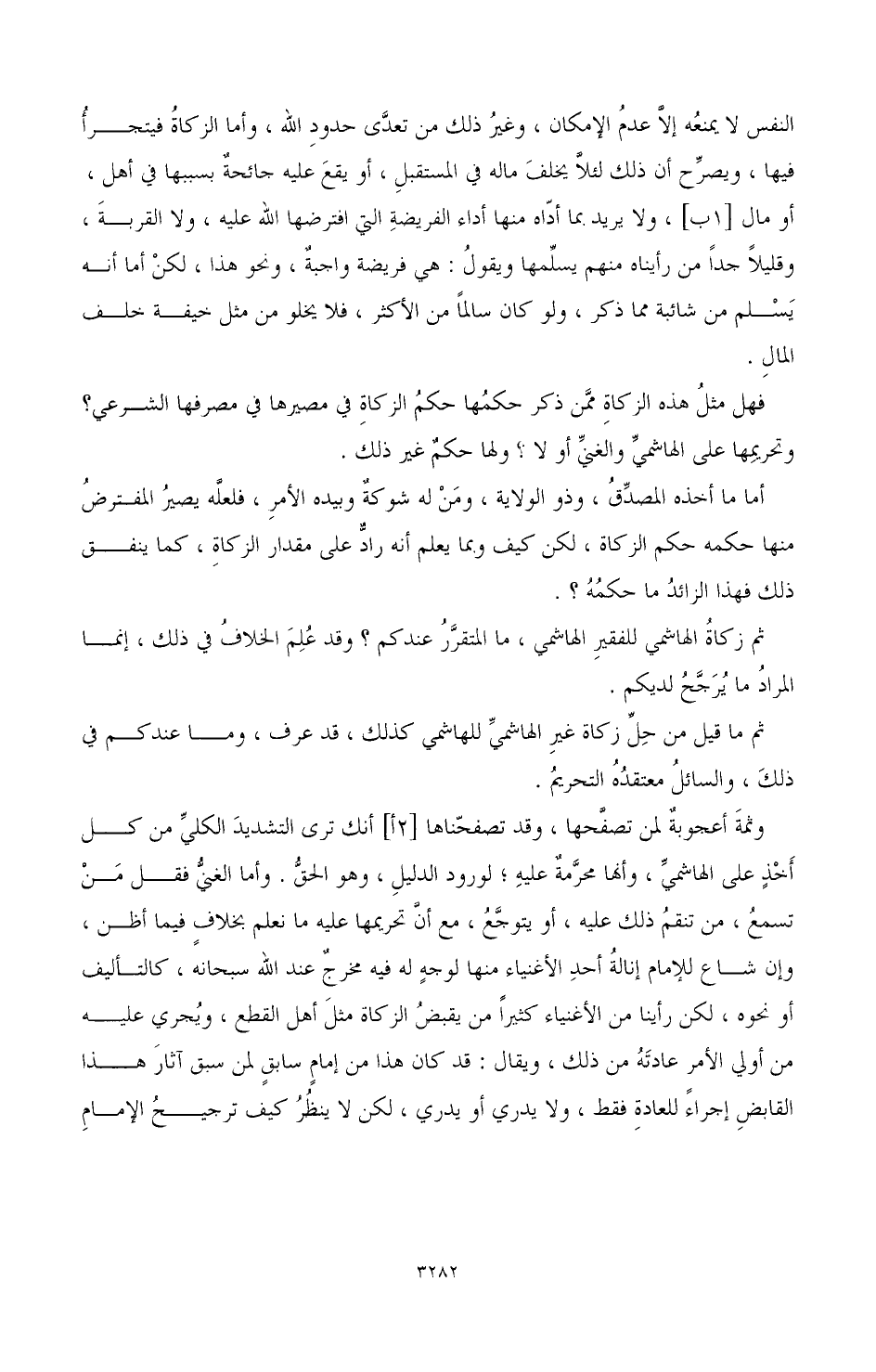وثمة أعجوبة لمن تصفحها، وقد تصفحناها أنك ترى التشديد الكلي من كل أخذ على الهاشمي، وأنها محرمة عليه؛ لورود الدليل، وهو الحق. وأما الغني فقل من تسمع، من تنقم ذلك عليه، أو يتوجع، مع أن تحريمها عليه ما نعلم بخلاف فيما أظن، وإن شاع للإمام إنالة أحد الأغنياء كثيرا من يقبض الزكاة مثل أهل القطع، ويجري عليه من أولي الأمر عادته من ذلك، ويقال: قد كان هذا من إمام سابق لمن سبق آثار هذا القابض إجراء للعادة فقط، ولا يدري أو يدري، لكن لا ينظر كيف ترجيح الإمام