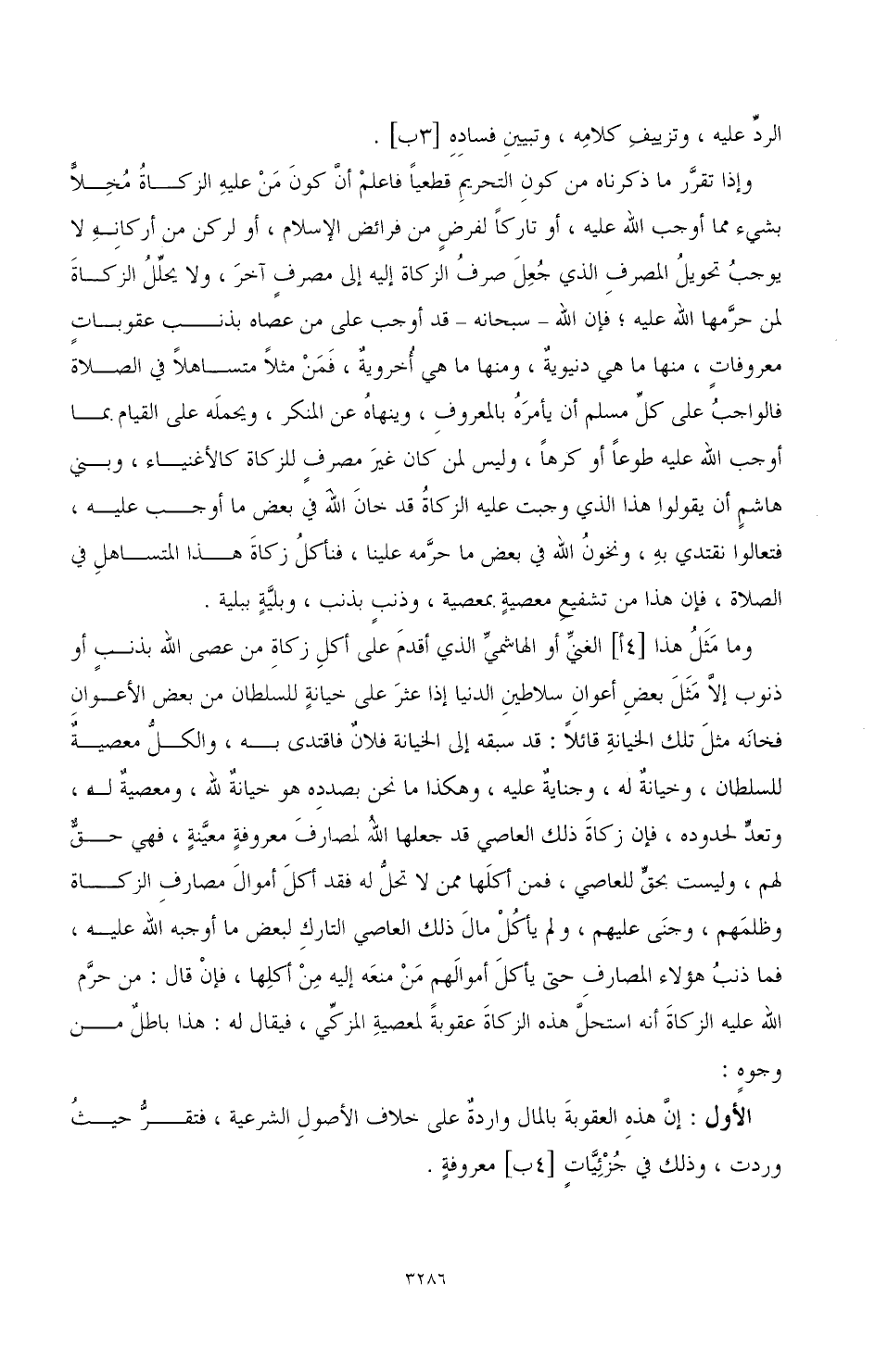 وما مثل هذا الغني أو الهاشمي لذي أقدم على أكل زكاة من عصى الله بذنب أو ذنوب إلا مثل بعض أعوان سلاطين الدنيا إذا عثر على خيانة للسلطان من بعض الأعوان فخانه مثل تلك الخيانة قائلا: قد سبقه إلى الخيانة فلان فاقتدى به، والكل معصية للسلطان، وخيانة له، وجناية عليه، وهكذا ما نحن بصدده هو خيانة لله، ومعصية له، وتعد لحدوده، فإن زكاة ذلك العاصي قد جعلها الله لمصارف معروفة معينة، فهي حق لهم، وليست بحق للعاصي، فمن أكلها ممن لا تحل له فقد أكل أموال مصارف الزكاة وظلمهم، وجنى عليهم، ولم يأكل مال ذلك العاصي التارك لبعض ما أوجبه الله عليه، فما ذنب هؤلاء المصارف حتى يأكل أموالهم من منعه إليه من أكلها، فإن قال من حرم الله عليه الزكاة أنه استحل هذه الزكاة عقوبة لمعصية المزكي، فيقال له: هذا باطل من وجوه: