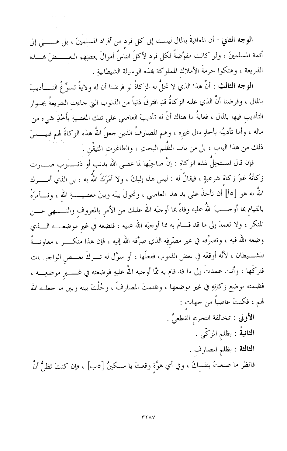 الوجه الثالث: أن هذا الذي لا تحل له الزكاة لو فرضنا أن له ولاية تسوغ التأديب بالمال , وفرضنا أن الذي عليه الزكاة قد افترق ذنبا من الذنوب التي جاءت الشريعة بجواز التأديب فيها بالمال، فغاية ما هناك أن له تأديب العاصي على تلك المعصية بأخذ شيء من ماله، وأما تأديبه بأخذ مال غيره، وهم المصارف الذين جعل الله هذه الزكاة لهم فليس ذلك من هذا الباب، بل من باب الظلم البحت، والطاغوت المتيقن.
