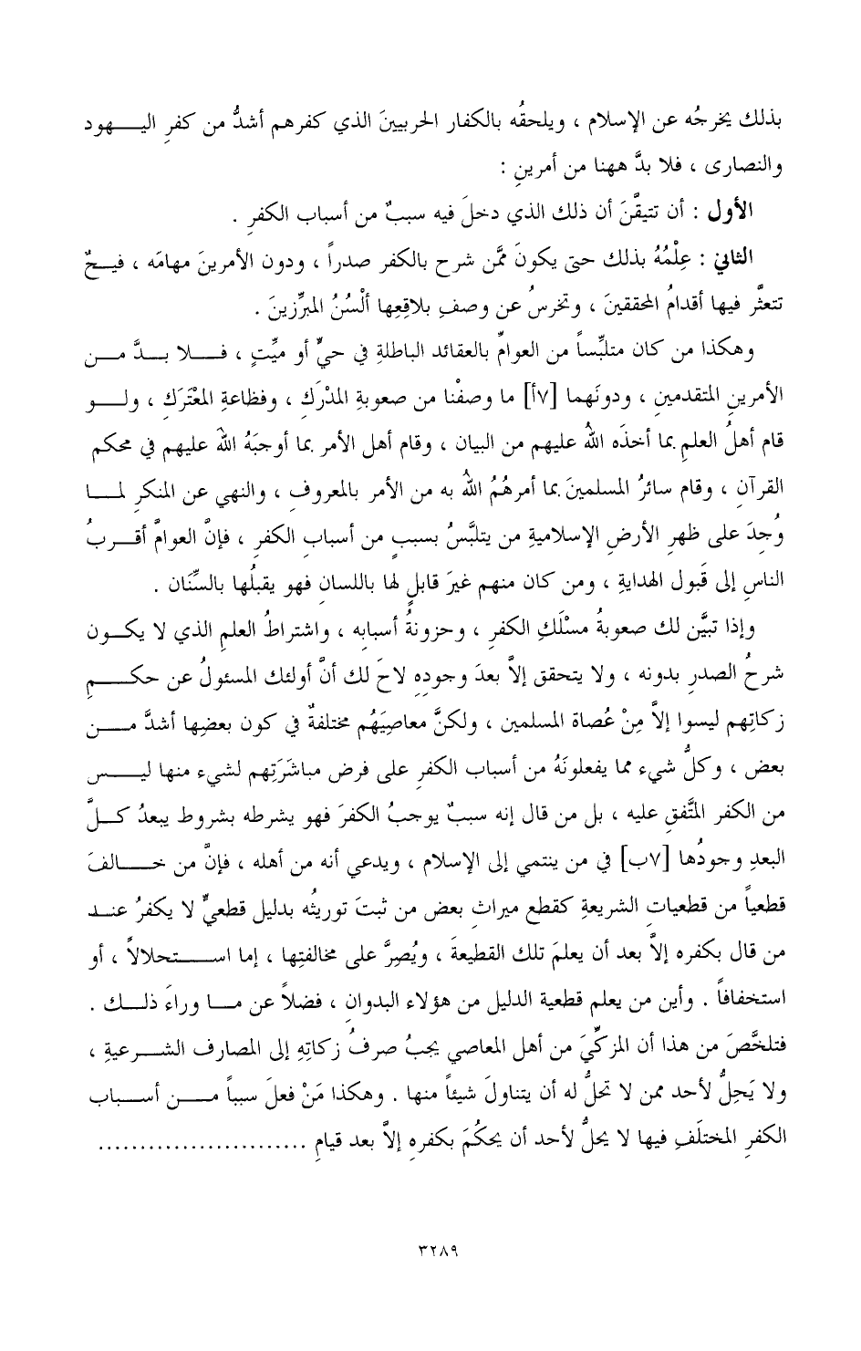 وإذا تبين لك صعوبة مسلك الكفر، وحزونة أسبابه , واشتراط العلم الذي لا يكون شرح الصدر بدونه، ولا يتحقق إلا بعد وجوده لاح لك أن أولئك المسئول عن حكم زكاتهم ليسوا إلا من عصاة المسلمين، ولكن معاصيهم مختلفة في كون بعضها أشد من بعض، وكل شيء مما يفعلونه من أسباب الكفر على فرض مباشرتهم لشيء منها ليس من الكفر المتفق عليه، بل من قال إنه سبب يوجب الكفر فهو يشرطه بشروط يبعد كل البعد وجودها في من ينتمي إلى الإسلام، ويدعي أنه من أهله، فإن من خالف قطعيا من قطعيات الشريعة كقطع ميراث بعض من ثبت توريثه بدليل قطعي لا يكفر عند من قال بكفره إلا بعد أن يعلم تلك القطعية، ويصر على مخالفتها، إما استحلالا، أو استخفافا. وأين من يعلم قطعية الدليل من هؤلاء البدوان، فضلا عن ما وراء ذلك. فتلخص من هذا أن المزكي من أهل المعاصي يجب صرف زكاته إلى المصارف الشرعية، ولا يحل لأحد ممن لا تحل له أن يتناول شيئا منها. وهكذا من فعل سببا من أسباب الكفر المختلف فيها لا يحل لأحد أن يحكم بكفره إلا بعد قيام ........................