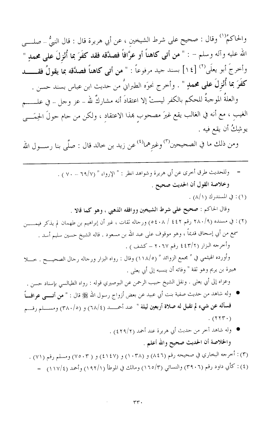 والحاكم (¬1) وقال: صحيح على شرط الشيخين، عن أبي هريرة قال: قال النبي -صَلَّى اللهُ عَلَيْهِ وَآلِهِ وَسَلَّمَ-: " من أتى كاهنا أو عرافا فصدقه فقد كفر بما أنزل على محمد " وأخرج أبو يعلى (¬2) [14] بسند جيد مرفوعا: " من أتى كاهنا فصدقه بما يقول فقد كفر بما أنزل على محمد " وأخرج نحوه الطبراني من حديث ابن عباس بسند حسن.