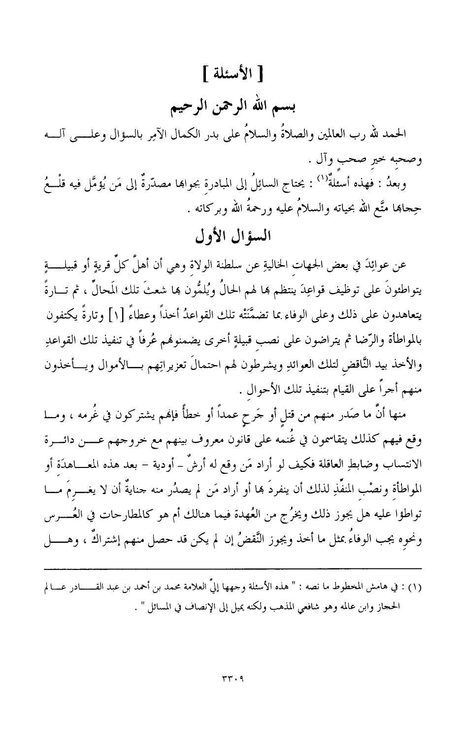 (¬1) في هامش المخطوط ما نصه: " هذه الأسئلة وجهها إلي العلامة محمد بن أحمد بن عبد القادر عالم الحجاز وابن عالمه وهو شافعي المذهب ولكنه يميل إلى الإنصاف في المسائل ".