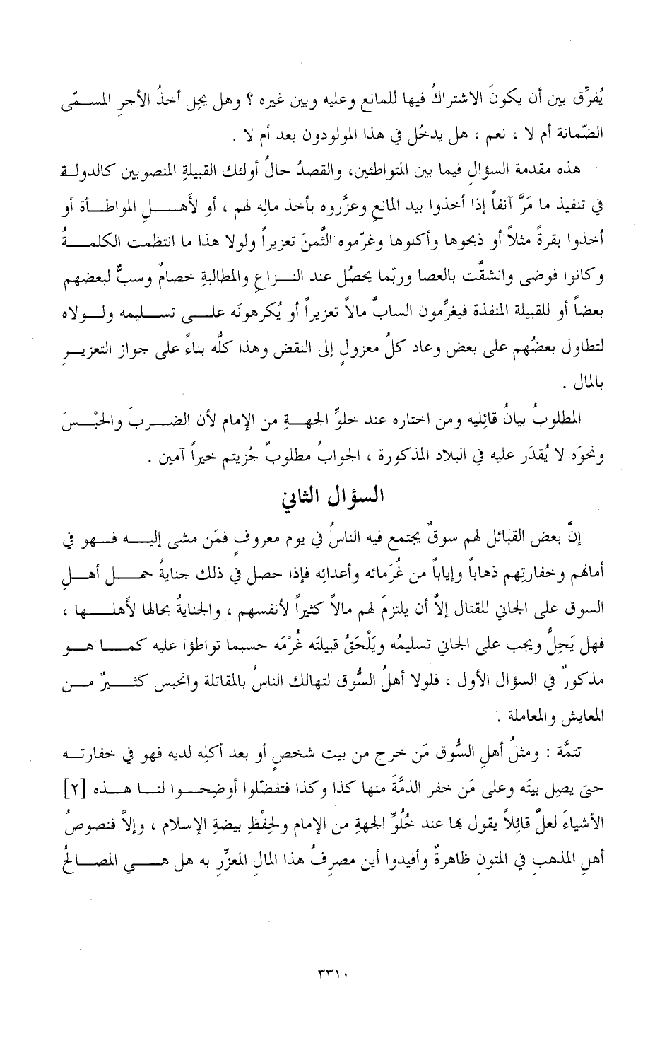 تتمة: ومثل أهل السوق من خرج من بيت شخص أو بعد أكله لديه فهو في خفارته حتى يصل بيته وعلى من خفر الذمة منها كذا وكذا فتفضلوا أوضحوا لنا هذه الأشياء لعل قائلا يقول بها عند خلو الجهة من الإمام ولحفظ بيضة الإسلام، وإلا فنصوص أهل المذهب في المتون ظاهرة وأفيدوا أين مصرف هذا المال المعزر به هل هي المصالح