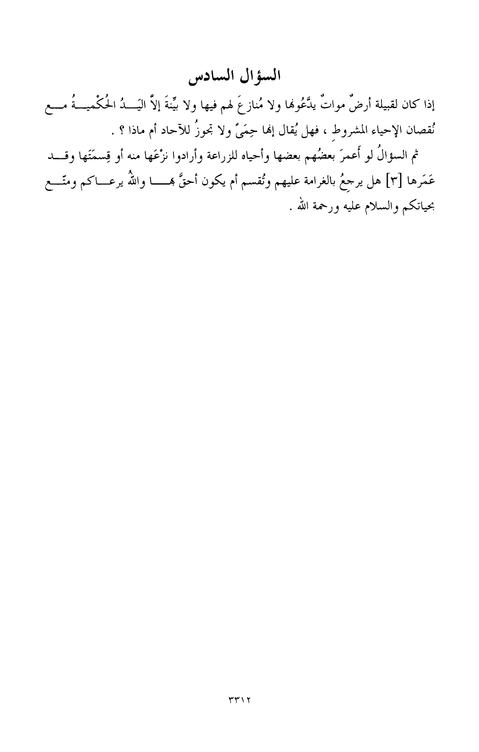 ثم السؤال لو أعمر بعضهم بعضها وأحياه للزراعة وأرادوا نزعها منه أو قسمتها وقد غمرها هل يرجع بالغرامة عليهم وتقسم أم يكون أحق بها والله يرعاكم ومتع بحياتكم والسلام عليه ورحمة الله.