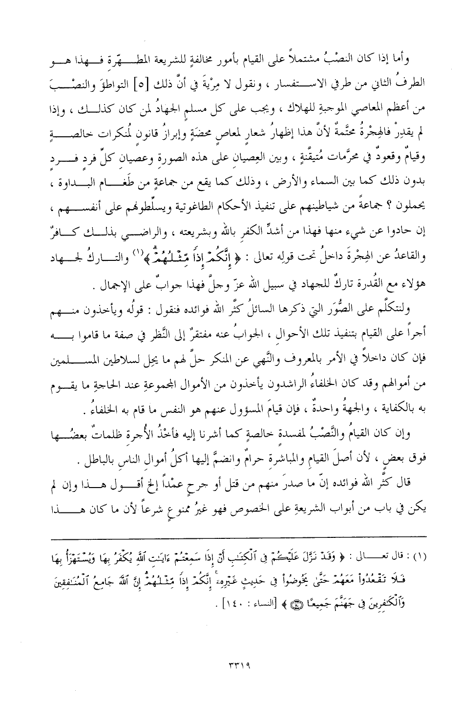 وأما إذا كان النصب مشتملا على القيام بأمور مخالفة للشريعة المطهرة فهذا هو الطرف الثاني من طرفي الاستفسار، ونقول: لا مرية في أن ذلك التواطؤ والنصب من أعظم المعاصي الموجبة للهلاك، ويجب على كل مسلم الجهاد لمن كان كذلك، وإذا لم يقدر فالهجرة محتمة لأن هذا إظهار شعار لمعاص محضة وإبراز قانون لمنكرات خالصة وقيام وقعود في محرمات متيقنة، وبين العصيان على هذه الصورة وعصيان كل فرد فرد بدون ذلك كما بين السماء والأرض، وذلك كما يقع من جماعة من طغام البداوة، يحملون؟ جماعة من شياطينهم على تنفيذ الأحكام الطاغوتية ويسلطونهم على أنفسهم، إن حادوا عن شيء منها فهذا من أشد الكفر بالله وبشريعته، والراضي بذلك كافر والقاعد عن الهجرة داخل تحت قوله تعالى: {إِنَّكُمْ إِذًا مِثْلُهُمْ} (¬1) والتارك لجهاد هؤلاء مع القدرة تارك للجهاد في سبيل لله عز وجل فهذا جواب على الإجمال.