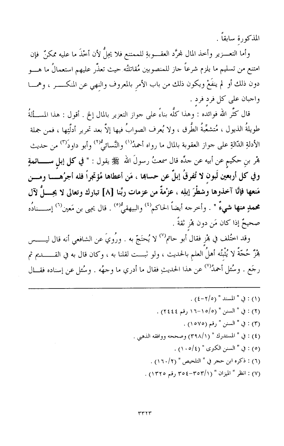 قال كثر الله فوائده: وهذا كله بناء على جواز التعزير بالمال إلخ. أقول: هذه المسألة طويلة الذيول، متشعبة الطرق، ولا يعرف الصواب فيها إلا بعد تحرير أدلتها، فمن جملة الأدلة الدالة على جواز العقوبة بالمال ما رواه أحمد (¬1) والنسائي (¬2) وأبو داود (¬3) من حديث بهز بن حكيم عن أبيه عن جده قال سمعت رسول الله - صَلَّى اللهُ عَلَيْهِ وَسَلَّمَ - يقول: " في كل إبل سائمة وفي كل أربعين لبون لا تفرق إبل عن حسابها، من أعطاها مؤتجرا فله أجرها ومن منعها فإنا آخذوها وشطر إبله، عزمة من عزمات ربنا تبارك وتعالى لا يحل لآل محمد منها شيء ". وأخرجه أيضًا الحاكم (¬4) والبيهقي (¬5). قال يحيى بن معين (¬6): إسناده صحيح إذا كان من دون بهز ثقة.
