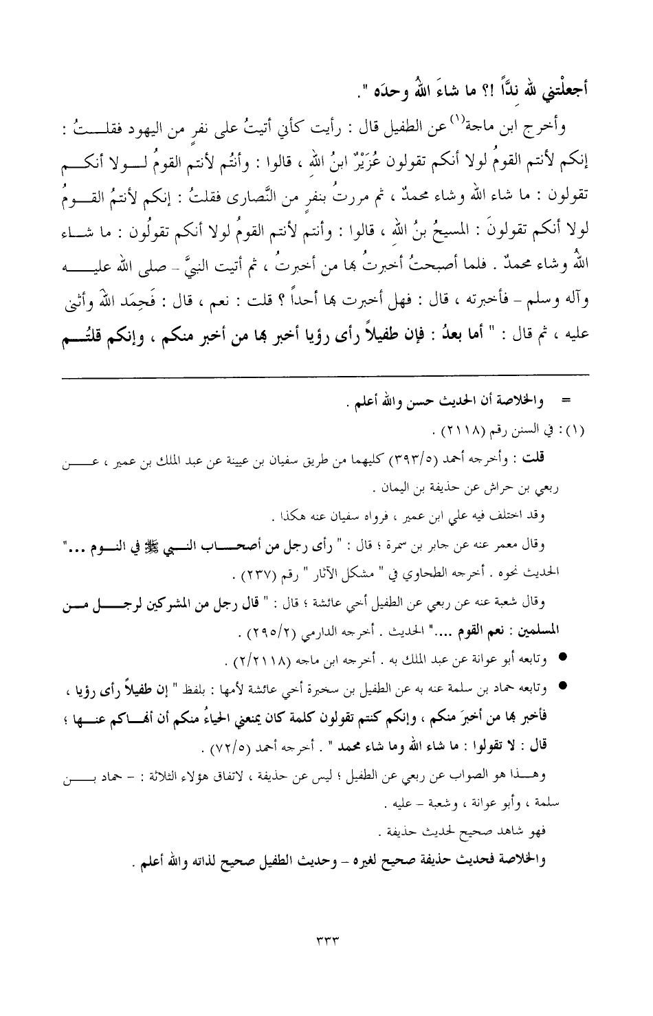 وأخرج ابن ماجه (¬1) عن الطفيل قال: رأيت كأني أتيت على نفر من اليهود فقلت: إنكم لأنتم القوم لولا أنكم تقولون عزير ابن الله، قالوا: وأنتم لأنتم القوم لولا أنكم تقولون: ما شاء الله وشاء محمد، ثم مررت بنفر من النصارى فقلت: إنكم لأنتم القوم لولا أنكم تقولون: المسيح ابن الله، قالوا: وأنتم لأنتم القوم لولا أنكم تقولون: ما شاء الله وشاء محمد. فلما أصبحت أخبرت بها من أخبرت، ثم أتيت النبي -صَلَّى اللهُ عَلَيْهِ وَآلِهِ وَسَلَّمَ- فأخبرته، قال: فهل أخبرت بها أحدا؟ قلت: نعم، قال: فحمد الله وأثنى عليه، ثم قال: " أما بعد: فإن طفيلا رأى رؤيا أخبر بها من أخبر منكم، وإنكم قلتم