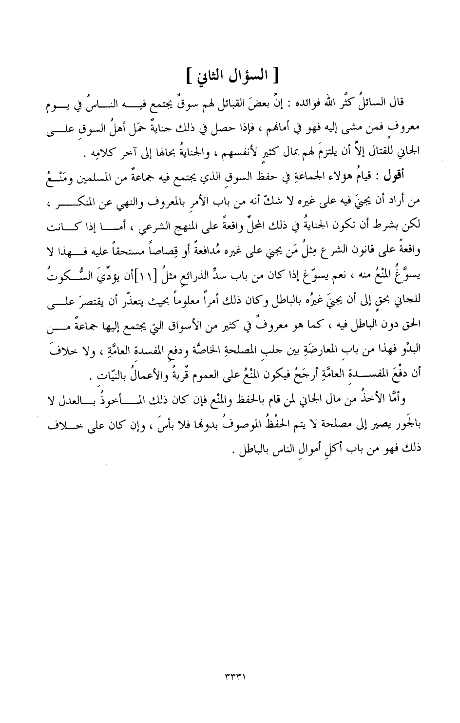 قال السائل كثر الله فوائده: إن بعض القبائل لهم سوق يجتمع فيه الناس في يوم معروف فمن مشى إليه فهو في أمانهم، فإذا حصل في ذلك جناية حمل أهل السوق على الجاني للقتال إلا أن يلتزم لهم بمال كثير لأنفسهم، والجناية بحالها إلى آخر كلامه.