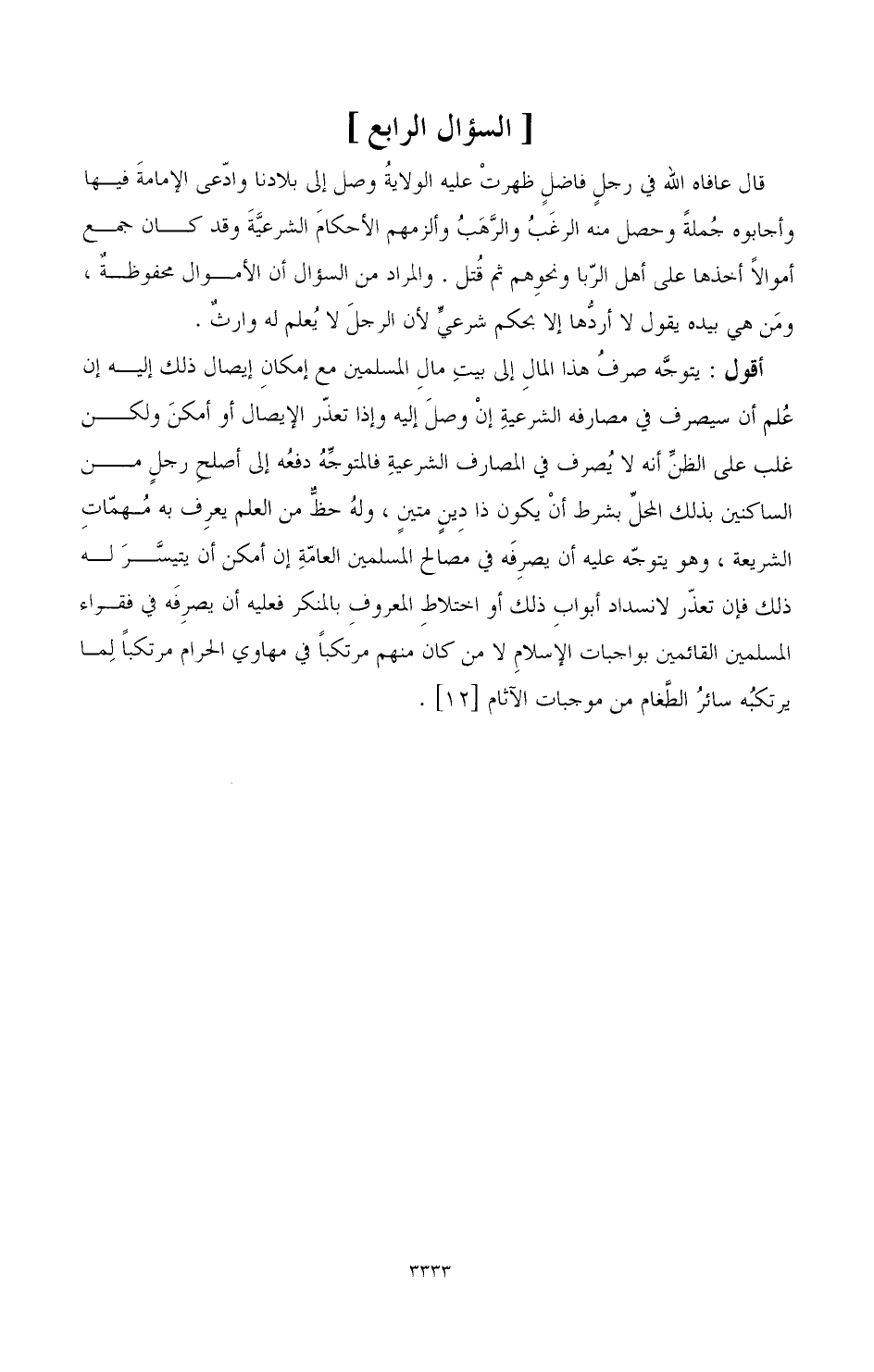 قال عافاه الله في رجل فاضل ظهرت عليه الولاية وصل إلى بلادنا وادعى الإمامة فيها وأجابوه جملة وحصل منه الرغب والرهب وألزمهم الأحكام الشرعية وقد كان جمع أموالا أخذها على أهل الربا ونحوهم ثم قتل. والمراد من السؤال أن الأموال محفوظة، ومن هي بيده يقول: لا أردها إلا بحكم شرعي لأن الرجل لا يعلم له وارث.