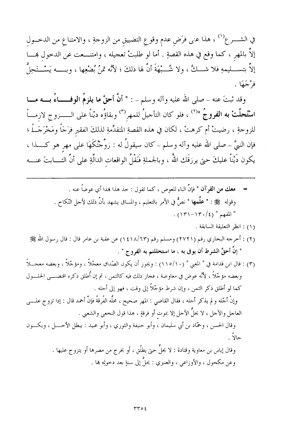 وقد ثبت عنه - صَلَّى اللهُ عَلَيْهِ وَآلِهِ وَسَلَّمَ -: " أن أحق ما يلزم الوفاء به ما استحلت به الفروج " (¬2)، فلو كان التأجيل للمهر (¬3) وبقاؤه دينا على الزوج لازما للزوجة، رضيت أم كرهت، لكان في هذه القصة المتقدمة لذلك الفقير فرجا ومخرجا، فإن النبي - صَلَّى اللهُ عَلَيْهِ وَآلِهِ وَسَلَّمَ - كان سيقول له: زوجتكها على مهر هو كذا، يكون دينا عليك حتى يرزقك لله، وبالجملة فنقل الواقعات الدالة على أن الثابت عنه