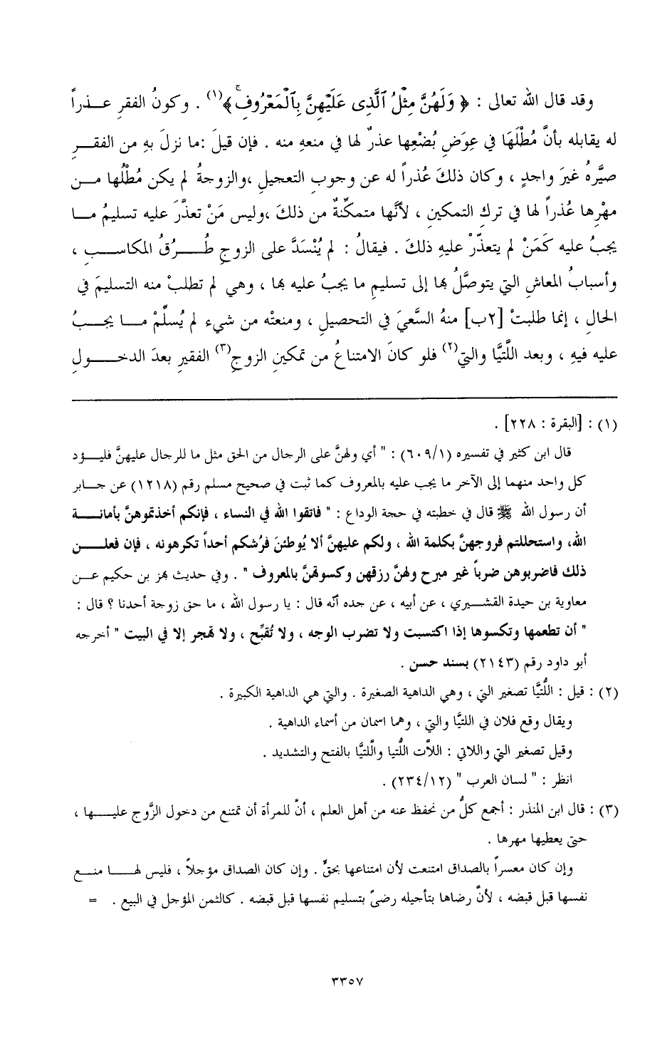 قال ابن كثير في تفسيره (1/ 609): " أي ولهن على الرجال من الحق مثل ما للرجال عليهن، فليؤد كل واحد منهما إلى الآخر ما يجب عليه بالمعروف كما ثبت في صحيح مسلم رقم (1218) عن جابر أن رسول الله - قال في خطبته في حجة الوداع: " فاتقوا الله في النساء، فإنكم أخذتموهن بأمانة الله، واستحللتم فروجهن بكلمة الله، ولكم عليهن ألا يوطئن فرشكم أحدا تكرهونه، فإن فعلن ذلك فاضربوهن ضربا غير مبرح، ولهن رزقهن وكسوتهن بالمعروف ". وفي حديث بهز بن حكيم عن معاوية بن حيدة القشيري، عن أبيه، عن جده أنه قال: يا رسول الله، ما حق زوجة أحدنا؟ قال: " أن تطعمها وتكسوها إذا اكتسيت ولا تضرب الوجه، ولا تقبح، ولا تهجر إلا في البيت " أخرجه أبو داود بسند حسن ".
