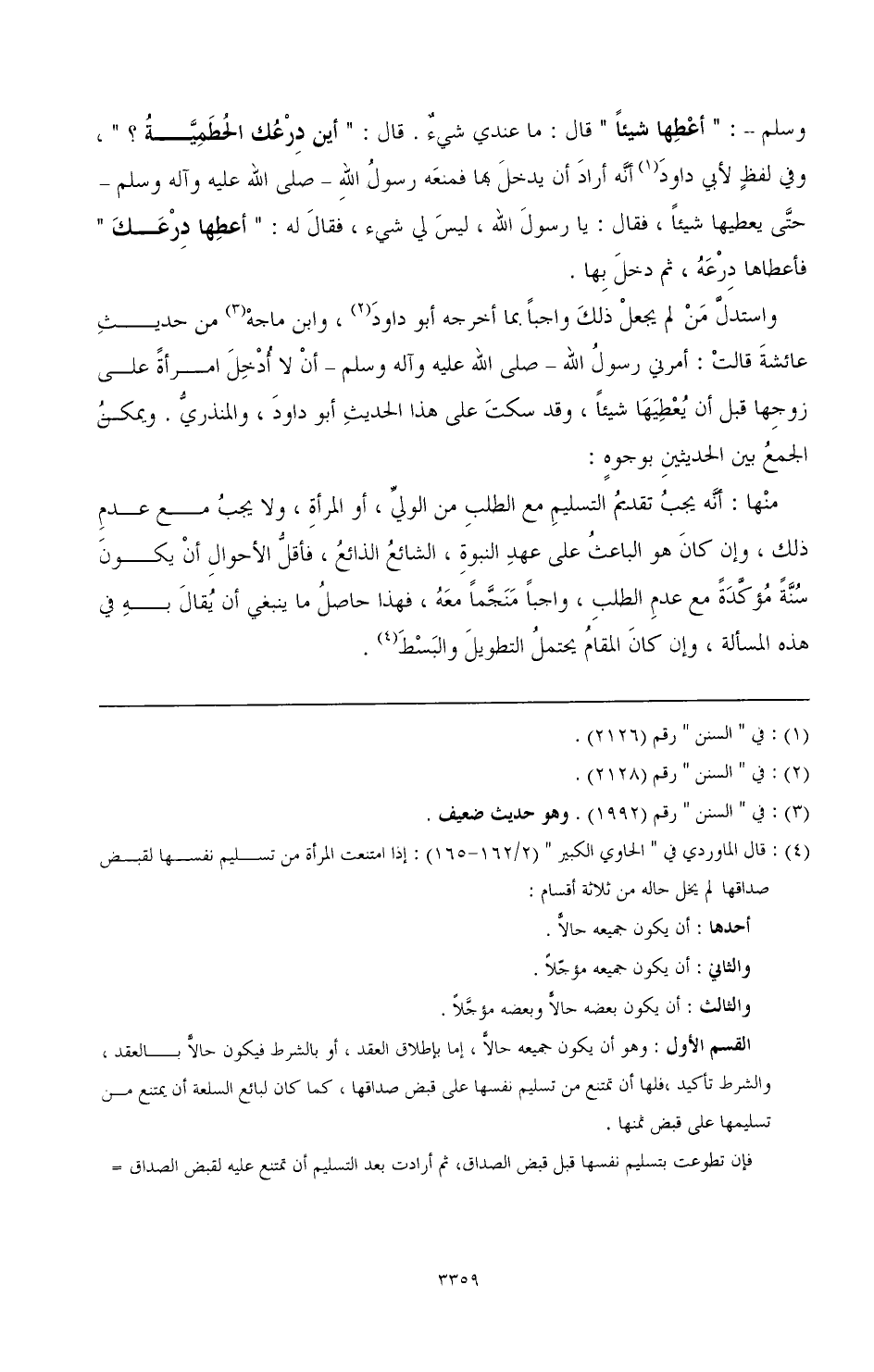 (¬4) قال الماوردي في " الحاوي الكبير " (2/ 162 - 165): إذا امتنعت المرآة من تسليم نفسها لقبض صداقها لم يخل خاله من ثلاثة أقسام:
