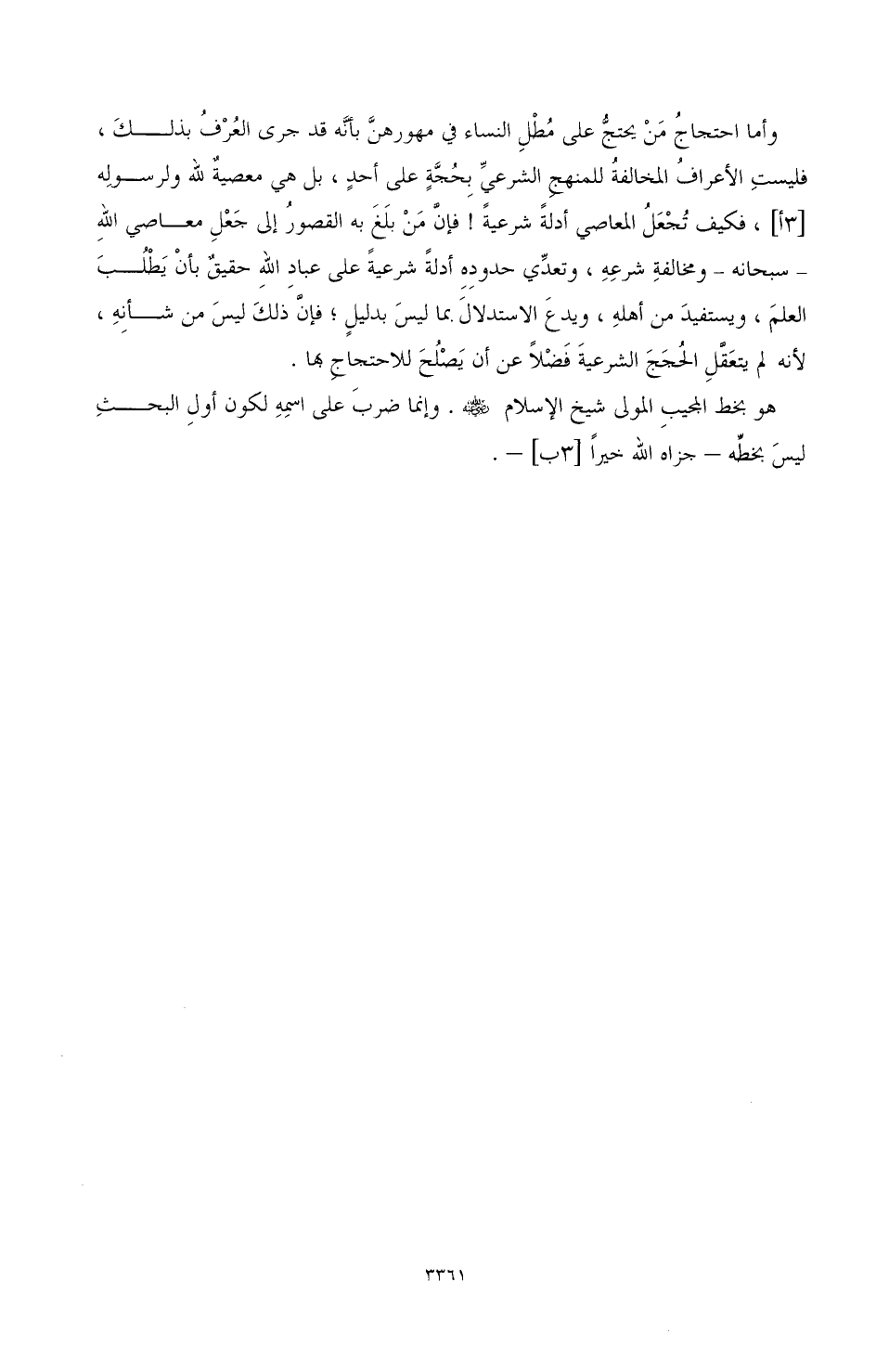 وأما احتجاج من يحتج على مطل النساء في مهورهن بأنه قد جرى العرف بذلك، فليست الأعراف المخالفة للمنهج الشرعي بحجة على أحد، بل هي معصية لله ولرسوله، فكيف نجعل المعاصي أدلة شرعية! فإن من بلغ به القصور إلى جعل معاصي الله - سبحانه - ومخالفة شرعه، وتعدي حدوده أدلة شرعية على عباد الله حقيق بأن يطلب العلم، ويستفيد من أهله , ويدع الاستدلال بما ليس بدليل، فإن ذلك ليس من شأنه لأنه لم يتعقل الحجج الشرعية فضلا عن أن يصلح للاحتجاج بها.