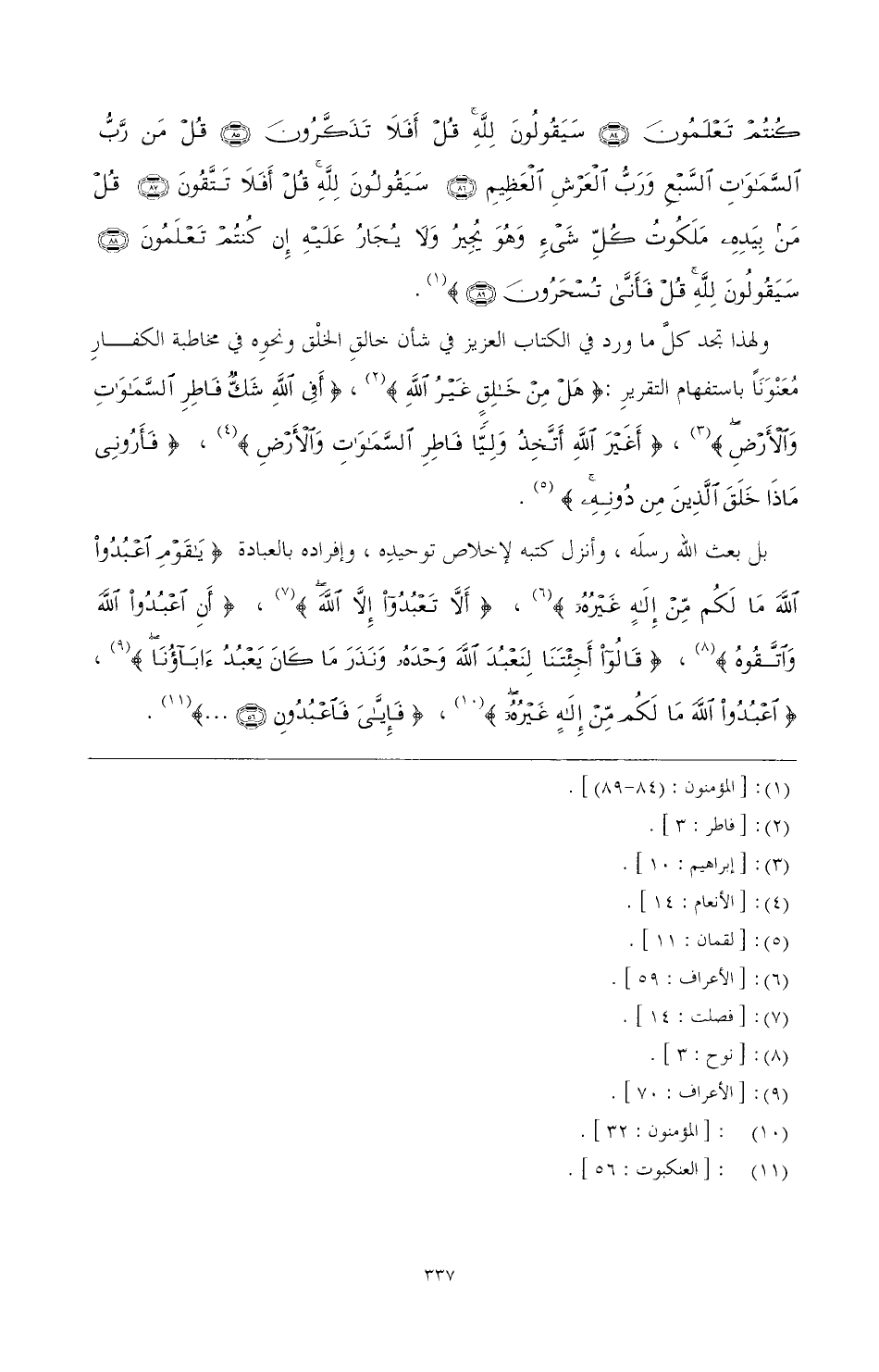 ولهذا تجد كل ما ورد في الكتاب العزيز في شأن خالق الخلق ونحوه في مخاطبة الكفار معنونا باستفهام التقرير:} هل من خالق غير الله {(¬2)،} أفي الله شك فاطر السماوات والأرض {(¬3)،} أغير الله أتخذ وليا فاطر السماوات والأرض {(¬4)،} فأروني ماذا خلق الذين من دونه {(¬5).