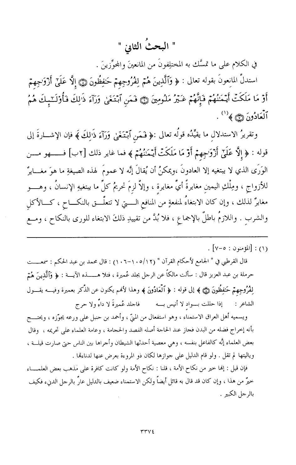 وتقرير الاستدلال ما يقيده قوله تعالى: {فَمَنِ ابْتَغَى وَرَاءَ ذَلِكَ} فإن الإشارة إلى قوله: {إِلَّا عَلَى أَزْوَاجِهِمْ أوْ مَا مَلَكَتْ أَيْمَانُهُمْ} فما غاير ذل فهو من الورى الذي لا يبتغيه إلا العادون، ويمكن أن يقال إنه لا عموم لهذه الصيغة ما هو مغاير للأرواح، وملك اليمين مغايرة أي مغايرة، وإلا لزم تحريم كل ما يبتغيه الإنسان، وهو مغاير لذلك، وإن كان الابتغاء لمنفعة من المنافع التي لا تتعلق بالنكاح، كالأكل والشرب. واللازم باطل بالإجماع، فلا بد من تقييد ذلك الابتغاء للورى، ومع
