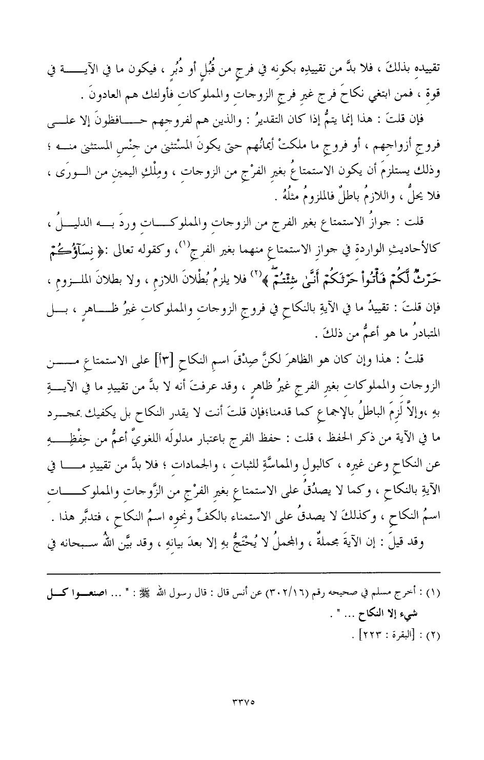قلت: هذا وإن كان هو الظاهر لكن صدق اسم النكاح على الاستمتاع من الزوجات والمملوكات بغير الفرج غير ظاهر، وقد عرفت أنه لا بد من تقييد ما في الآية به، وإلا لزم الباطل بالإجماع كما قدمنا؛ فإن قلت أنت لا يقدر النكاح بل يكفيك بمجرد ما في الآية من ذكر الحفظ، قلت: حفظ الفرج باعتبار مدلوله اللغوي أعم من حفظه عن النكاح وعن غيره، كالبول والمماسة للثبات، والجمادات، فلا بد من تقييد ما في الآية بالنكاح، وكما لا يصدق على الاستمتاع بغير الفرج من الزوجات والمملوكات اسم النكاح، وكذلك لا يصدق على الاستمناء بالكف ونحوه اسم النكاح، فتدبر هذا.
