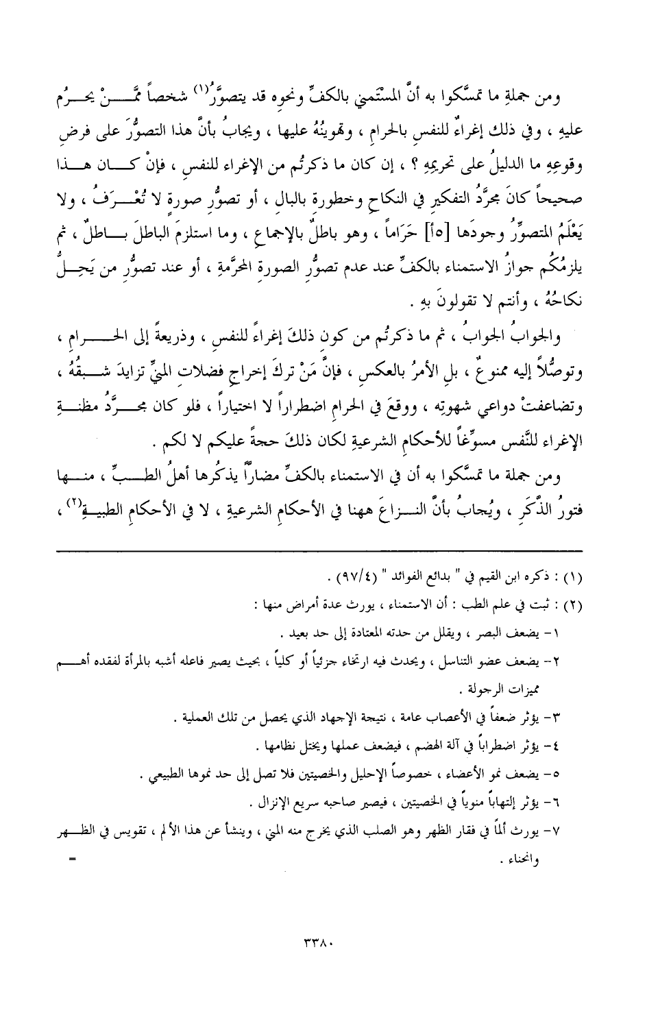 والجواب الجواب، ثم ما ذكرتم من كون ذلك إغراء للنفس، وذريعة إلى الحرام، وتوصلا إليه ممنوع، بل الأمر بالعكس، فإن من ترك إخراج فضلات المني تزايد شبقه، وتضاعفت دواعي شهوته، ووقع في الحرام اضطرارا لا اختيارا، فلو كان مجرد مظنة الإغراء للنفس مسوغا للأحكام الشرعية لكان ذلك حجة عليكم لا لكم.