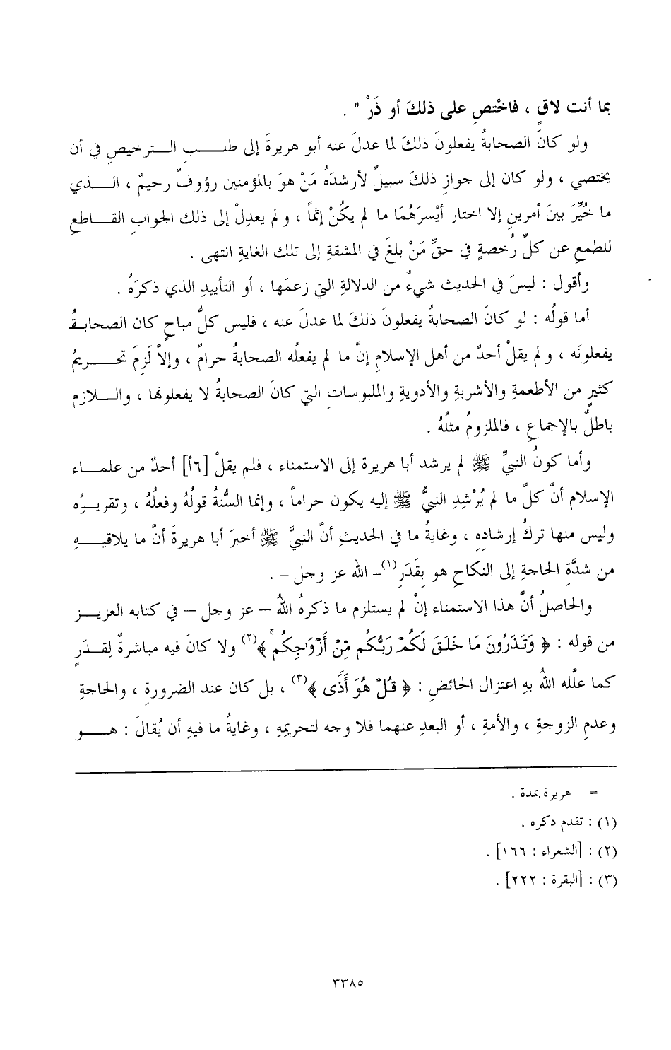 وأما كون النبي صَلَّى اللهُ عَلَيْهِ وَسَلَّمَ لم يرشد أبا هريرة إلى الاستمناء، فلم يقل أحد من علماء الإسلام أن كل ما لم يرشد النبي صَلَّى اللهُ عَلَيْهِ وَسَلَّمَ إليه يكون حراما، وإنما السنة قوله وفعله، وتقريره، وليس منها ترك إرشاده، وغاية ما في الحديث أن النبي صَلَّى اللهُ عَلَيْهِ وَسَلَّمَ أخبر أبا هريرة أن ما يلاقيه من شدة الحاجة إلى النكاح هو بقدر الله (¬1)، عز وجل.