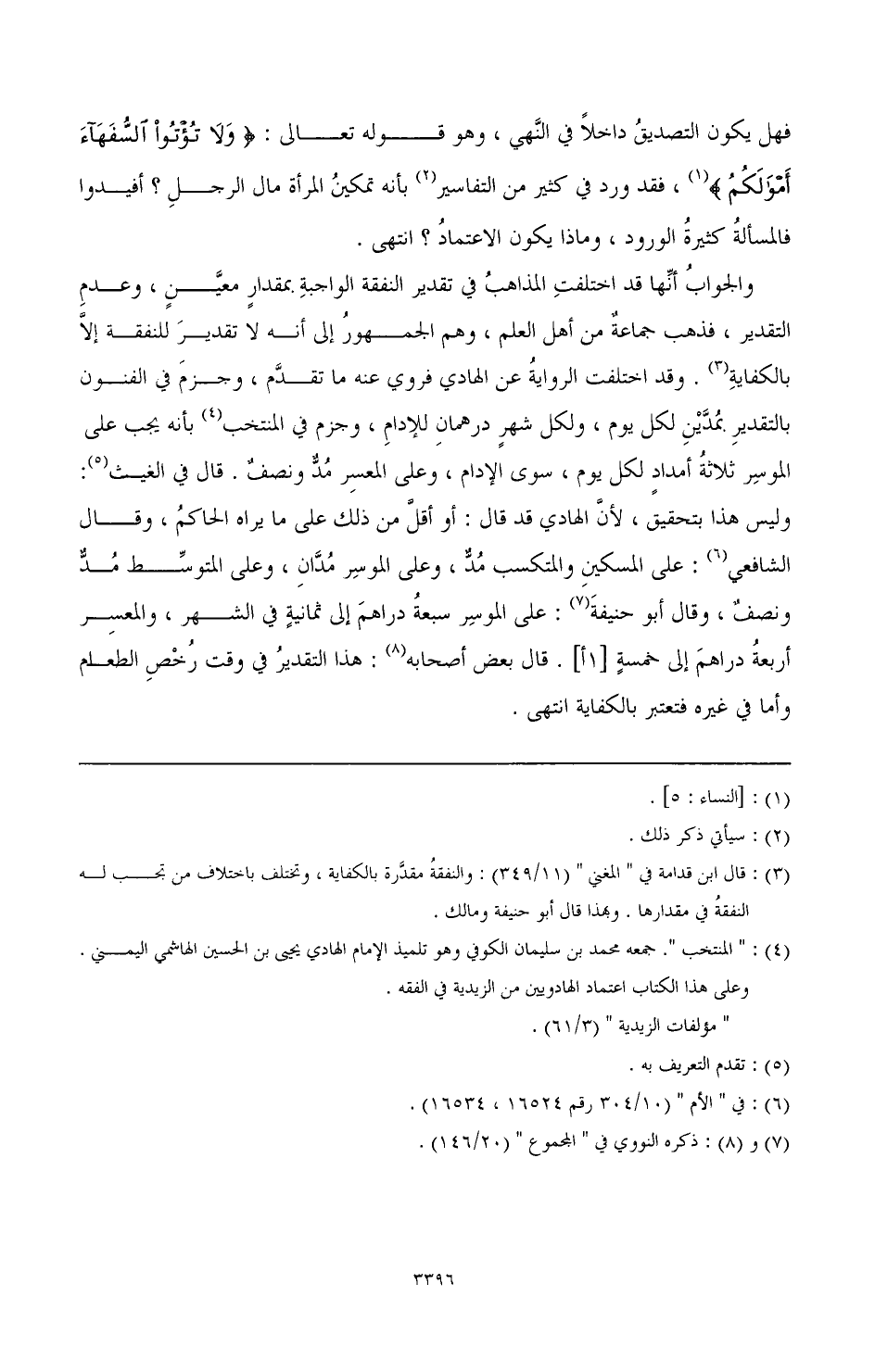 فهل يكون التصديق داخلا في النهي، وهو قوله تعالى: {وَلَا تُؤْتُوا السُّفَهَاءَ أَمْوَالَكُمُ} (¬1)، فقد ورد في كثير من التفاسير (¬2) بأنه تمكين المرأة مال الرجل؟ أفيدوا فالمسألة كثيرة الورود، وما ذا يكون الاعتماد؟ انتهى.