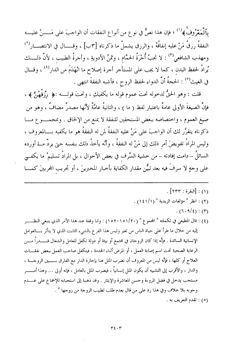 (¬4) قال المطيعي في تكملته " المجموع " (20/ 151 - 152): ولنا وقفة عند هذا الأمر الذي ينبغي النظر إليه من خلال ما طرأ على حياة الناس من تغير وليس هذا الفرع بالشيء الثابت الذي لا يتأثر بالعوامل الإنسانية السائدة، فإنه إذا كان الزوجان في مجتمع أو بيئة أو دولة تكفل للعامل والشغال قدرا من الرعاية الصحية تحت اسم إصابة العمل، أو المرض أثناء الخدمة، فيتكفل صاحب لعمل ببعض نفقات العلاج أو كلها، فإنه ليس من المعروف أن نضرب المثل هنا بإجارة الدار مع الفارق بين الزوجة، والدار، والأقرب إلى التشبيه أن يكون المثل إنسانيا، فيضرب المثل بالعامل فإنه أولى .... وهذا أمر مستحب يدخل في فضل المروءة وحسن المعاشرة والإيثار. وقد ذهبنا إلى استحبابه للإجماع على عدم وجوبه بلا خلاف، وفي هذا رد على من قال بعدم طلب تطيب الزوجة من زوجها ".