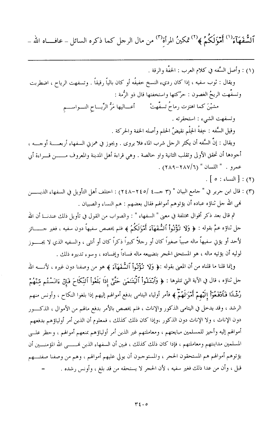(¬3) قال ابن جرير في " جامع البيان " (3 جـ 4/ 245 - 248): اختلف أهل التأويل في السفهاء الذين نهى الله جل ثناؤه عباده أن يؤتوهم أموالهم، فقال بعضهم: هم النساء والصبيان.