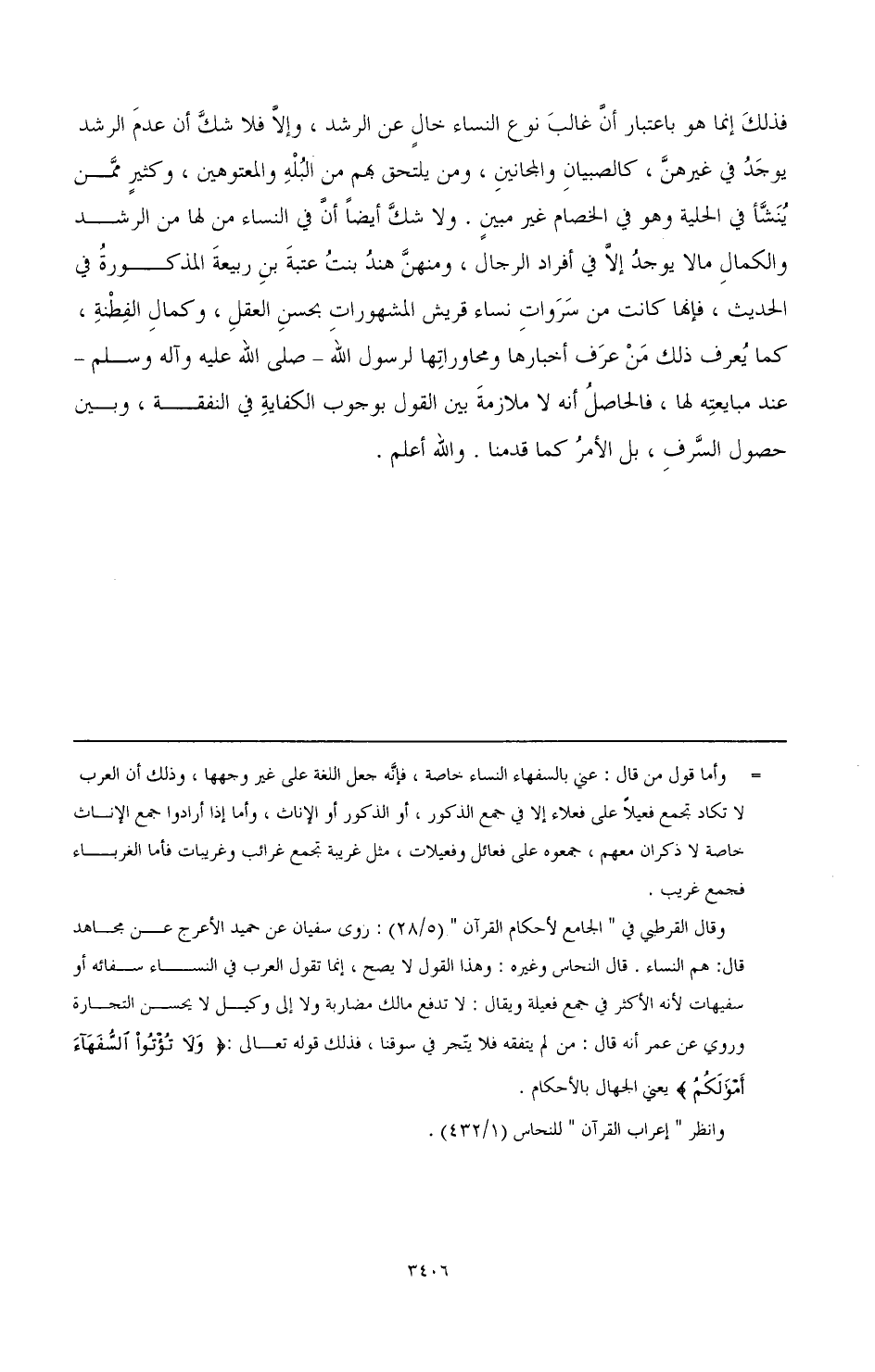 فذلك إنما هو باعتبار أن غالب نوع النساء خال عن الرشد، وإلا فلا شك أن عدم الرشد يوجد في غيرهن، كالصبيان والمجانين، ومن يلتحق بهم من البله والمعتوهين، وكثير ممن ينشأ في الحلية وهو في الخصام غير مبين. ولا شك أيضًا أن في النساء من لها من الرشد والكمال ما لا يوجد في أفراد الرجال، ومنهن هند بنت عتبة بن ربيعة المذكورة في الحديث، فإنها كانت من سروات نساء قريش المشهورات بحسن العقل، وكمال الفطنة، كما يعرف ذلك من عرف أخبارها ومحاوراتها لرسول الله - صَلَّى اللهُ عَلَيْهِ وَآلِهِ وَسَلَّمَ - عند مبايعته لها، فالحاصل أنه لا ملازمة بين القول بوجوب الكفاية في النفقة، وبين حصول السرف، بل الأمر كما قدمنا، والله أعلم.