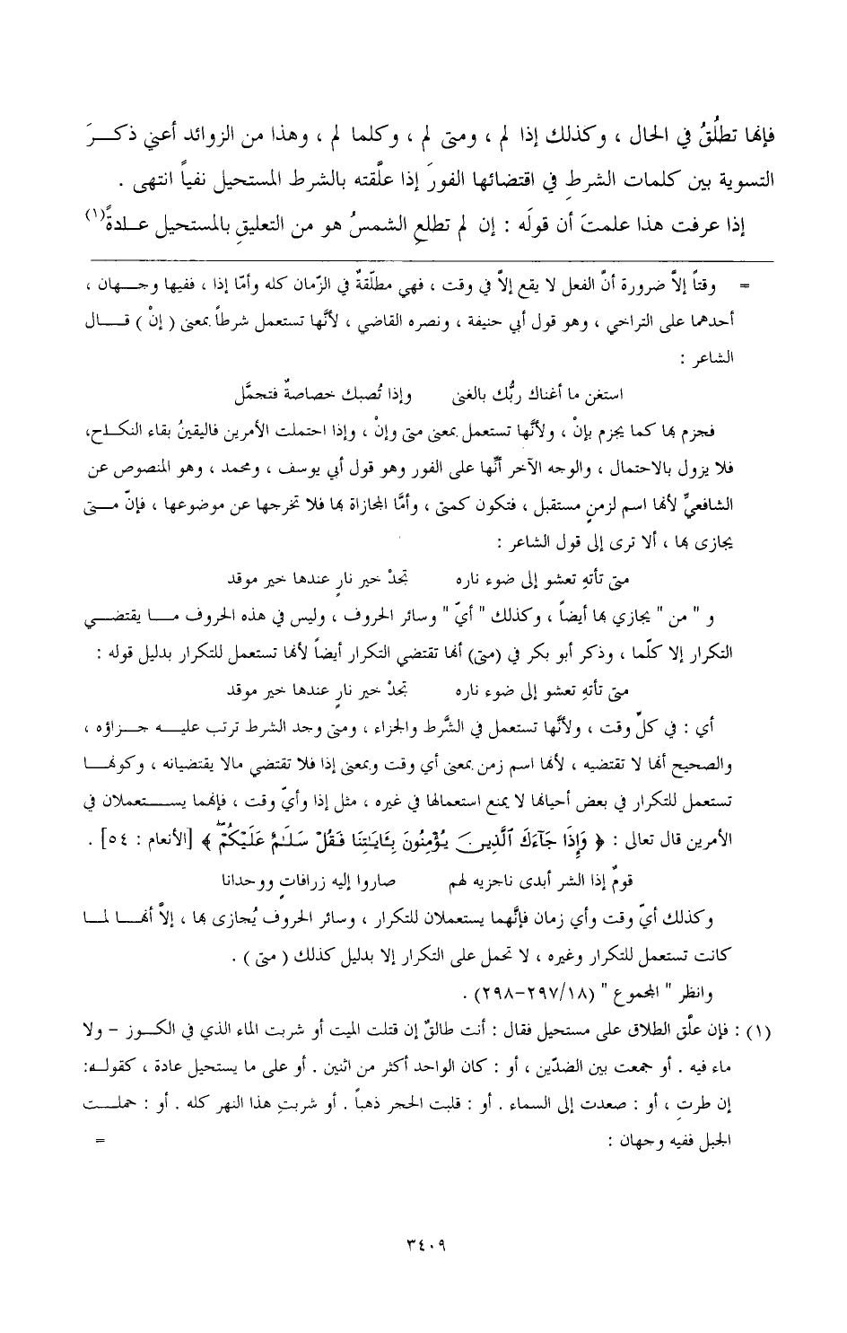 فإنها تطلق في الحال، وكذلك إذا لم، ومتى لم، وكلما لم، وهذا من الزوائد، أعني ذكر التسوية بين كلمات الشرط في اقتضائها الفور إذا علقته بالشرط المستحيل نفيا. انتهى.
